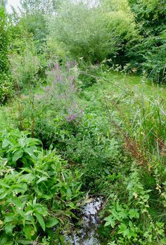 On peut y comptabiliser plus d'une vingtaine d'espèces : consoude, myosotis, salicaire, épilobe, ortie, berce commune, genre de cresson avec des petites fleurs blanches, chèvre-feuille, prêle des champs, géranium herbe à Robert, rumex crispus, au moins 2 sortes de graminées, dans l'eau une plante avec des feuilles en couronne (élodée ?), saule, frêne, aulne, bambou. Sur la gauche, haie d'un jardin : laurier cerise, rosier. Et d'autres que je ne connais pas encore...