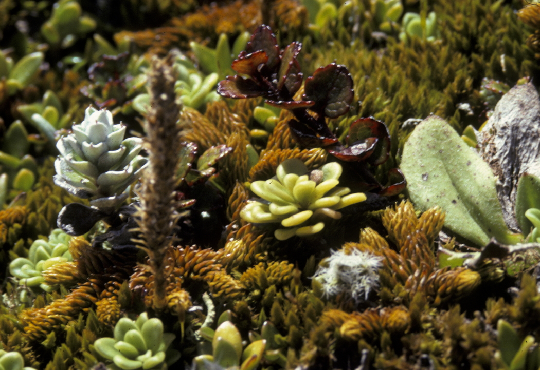 Elle protège du vent et de l'érosion deux autres espèces plus petites qui vivent ici au ras du sol. La première est aussi une succulente, elle peut donc faire provision d'eau douce, elle est charnue (sedum, orpin?)comme carpobrotus. La deuxième est rigolote, il faut se mettre au ras du sol pour comprendre les longues tiges rampantes et les drôles de fleurs...mais je ne trouve pas son nom (corrigole des grèves? c'est ma meilleure estimation).