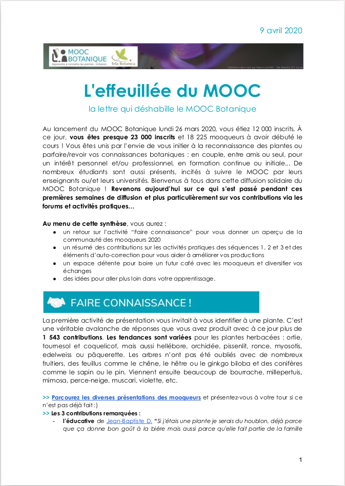 Au lancement du MOOC Botanique lundi 26 mars 2020, vous étiez 12 000 inscrits. À ce jour, vous êtes presque 23 000 inscrits et 18 225 mooqueurs à avoir débuté le cours ! Vous êtes unis par l’envie de vous initier à la reconnaissance des plantes ou parfaire/revoir vos connaissances botaniques : en couple, entre amis ou seul, pour un intérêt personnel et/ou professionnel, en formation continue ou initiale... De nombreux étudiants sont aussi présents, incités à suivre le MOOC par leurs enseignants ou/et leurs universités. Bienvenus à tous dans cette diffusion solidaire du MOOC Botanique ! Revenons aujourd’hui sur ce qui s’est passé pendant ces premières semaines de diffusion et plus particulièrement sur vos contributions via les forums et activités pratiques…