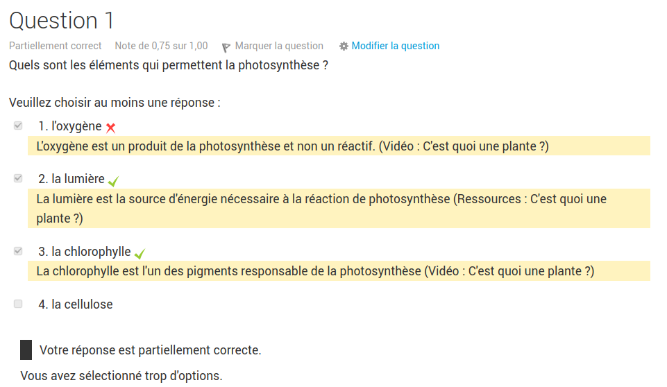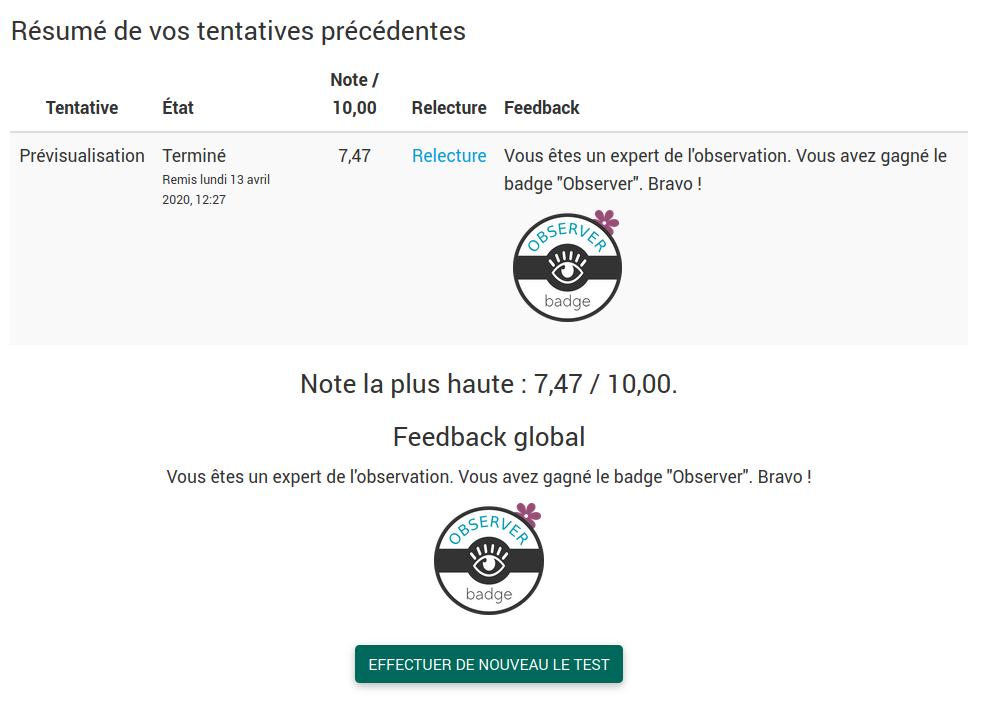 Re: résultat du quizz par Fondation UVED, lundi 13 avril 2020, 16:35 Nombre de réponses : 0 Bonjour,Vous avez normalement des feedback qui s'affichent à chaque tentative pour améliorer vos réponses comme ici : Et vous pouvez ensuite refaire le test 3 fois en cliquant sur le bouton correspondant : Bien à vous,Audrey pour Tela Botanica Permalien Niveau supérieur