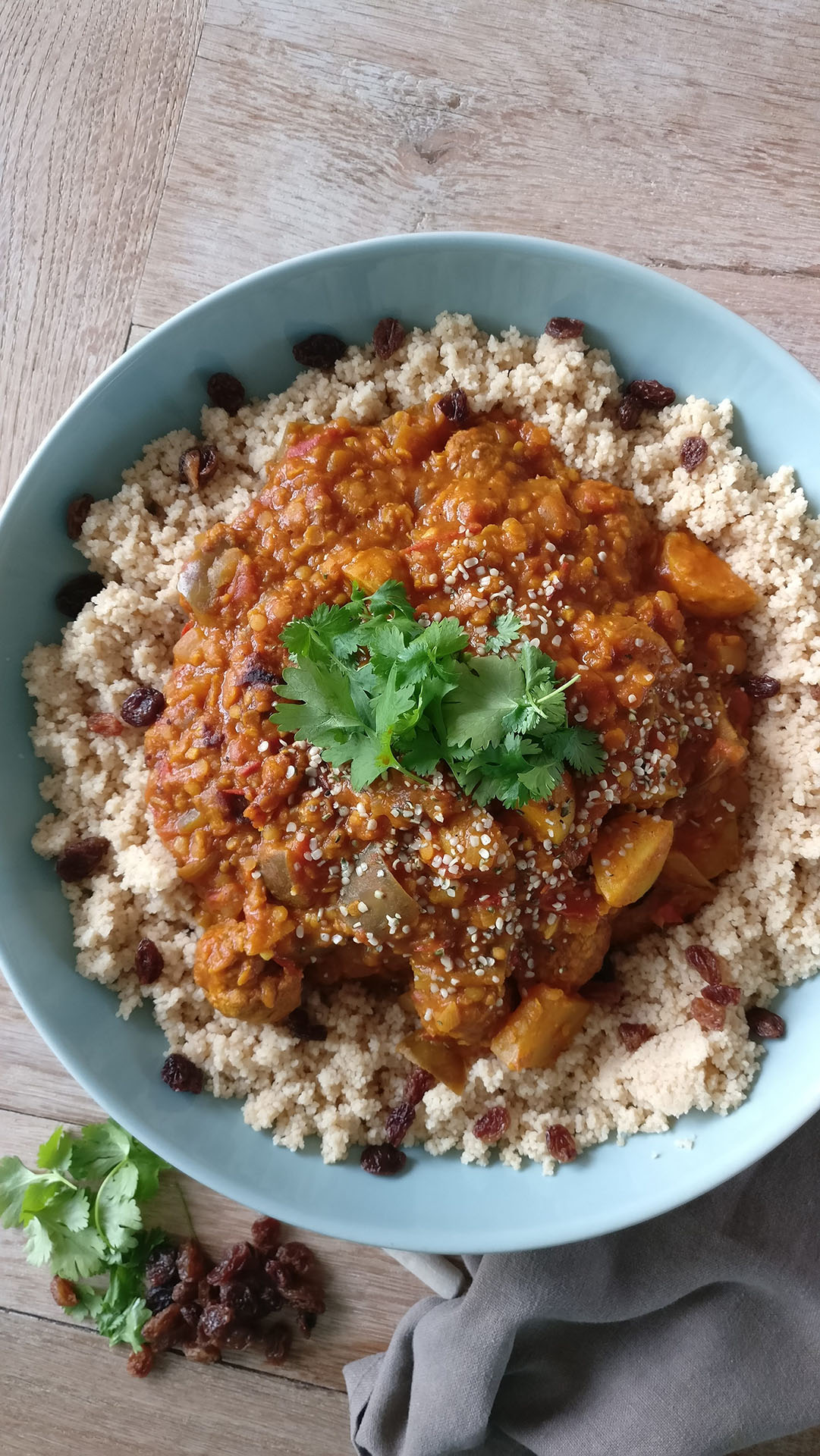 Couscous de légumes d'été, lentilles et raisins.
