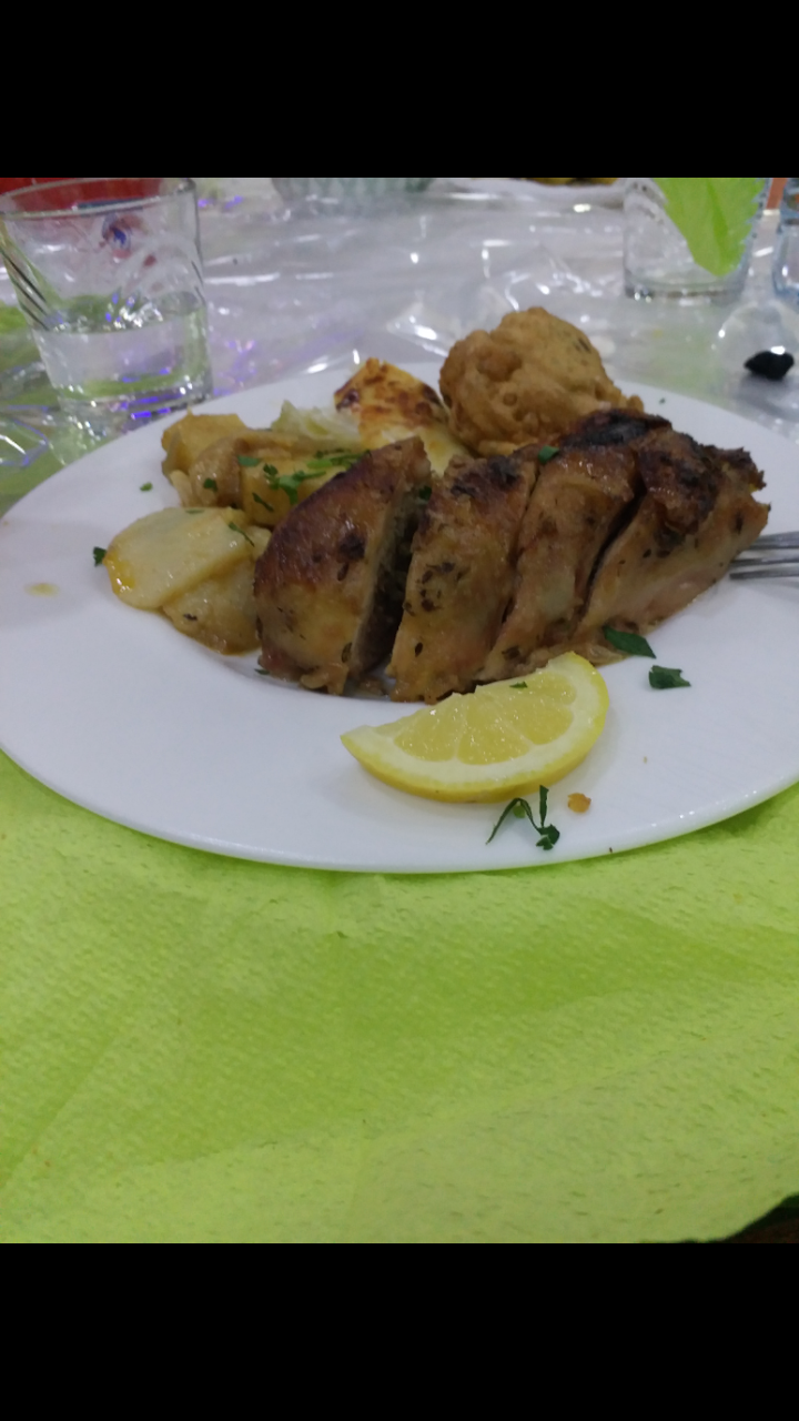 Je vous présente un plat préparé dans notre fête familiale, vous avez un poulet roulé farci aux viandes hachés, servit à côté de pomme de terre gratin, et le cou fleur bouillie ensuite mis en oeuf, farine ou chapelure et cuir dans l'huile.