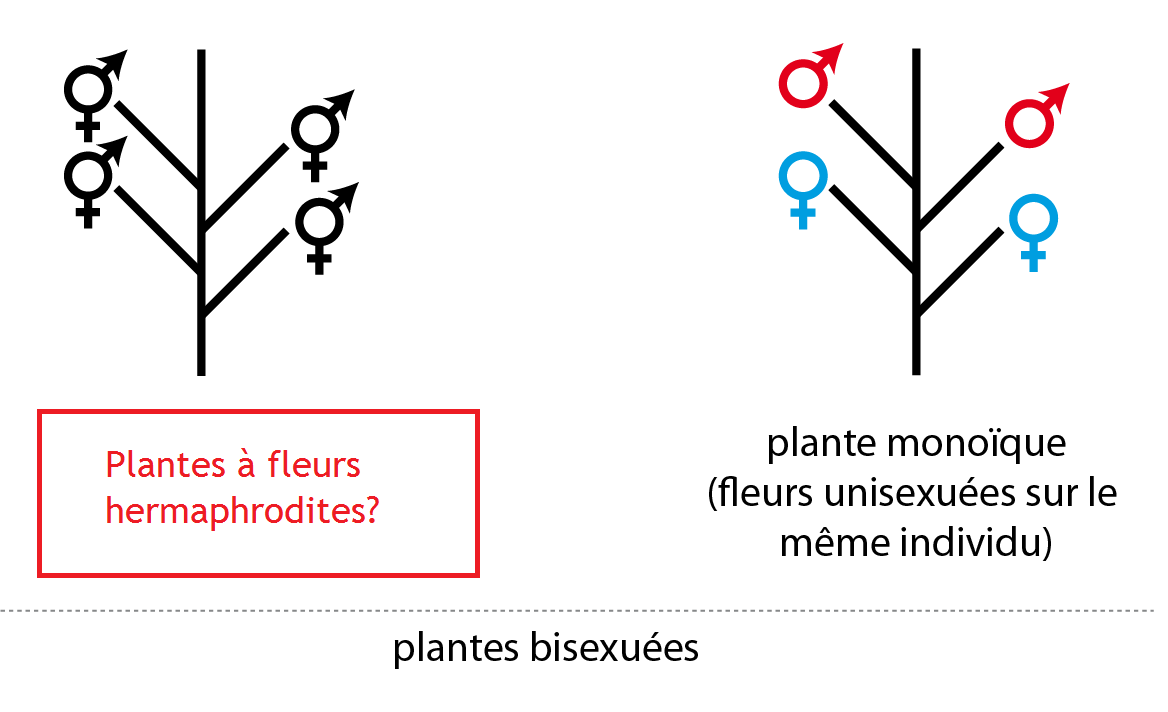 Noter qu'en comparaison avec les animaux, une plante qui porte des fleurs unisexuées mâles et des fleurs unisexuées femelles est, elle aussi, en tant qu'individu hermaphrodite mais, pour distinguer du cas où toutes les fleurs sont bisexuées, on la qualifie de monoïque (de mono, un, et oikos, maison) car une seule "maison" (un seul individu) réunit des fleurs mâles et des fleurs femelles.