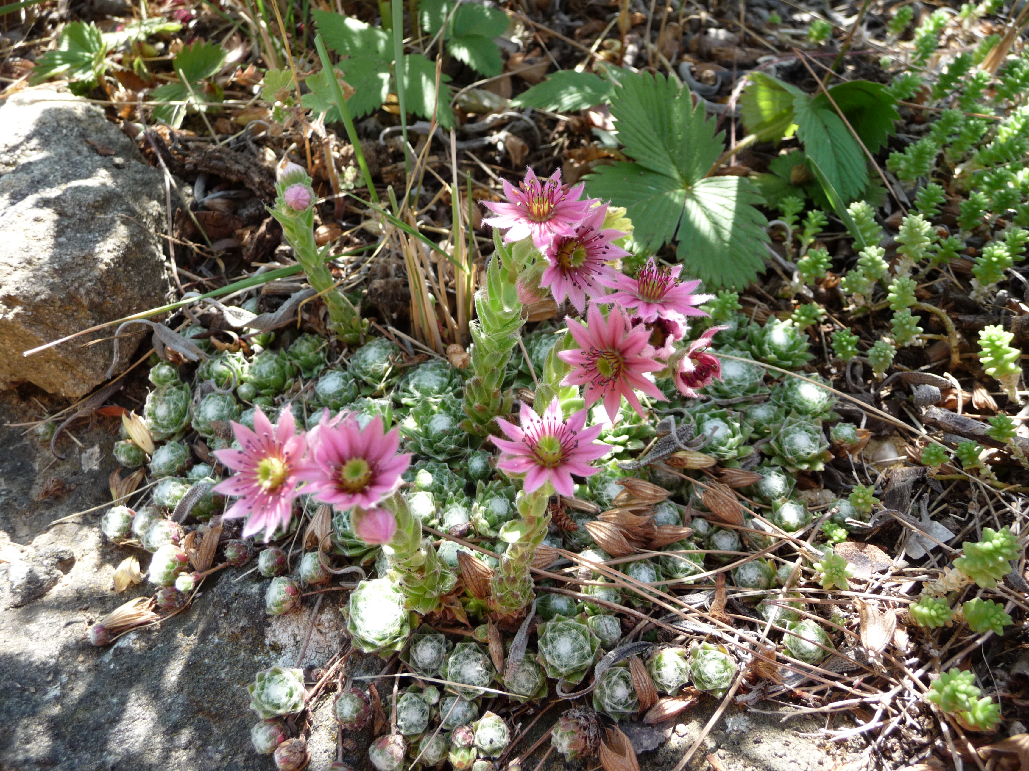 Cela dit la petite joubarbe me fait penser à S. arachnoideum à cause d'une sorte de toile d'araignée qui relie l'apex des feuilles. La grande me fait douter entre S. montanum et S. tectorum. Les avis d'autres mooqueurs ou mooqueuses sont bien sûr bienvenus et qui sait? Nous aurons peut-être un avis plus fiable d'un vrai botaniste?