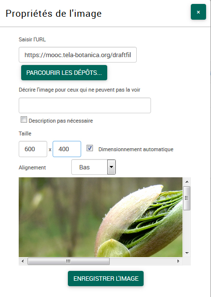 Vous revenez alors à la première fenêtre de dialogue, commune à l'insertion d'une image avec son URL ou par dépôt.