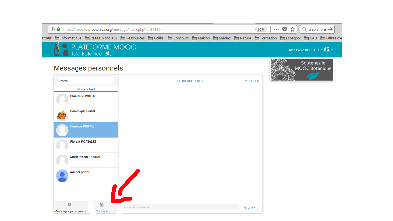 Ensuite, vous devez selectionner l'onglet 'Contact' au pied de la page et chercher le nom de la personne en question avec le moteur de recherche dédié.