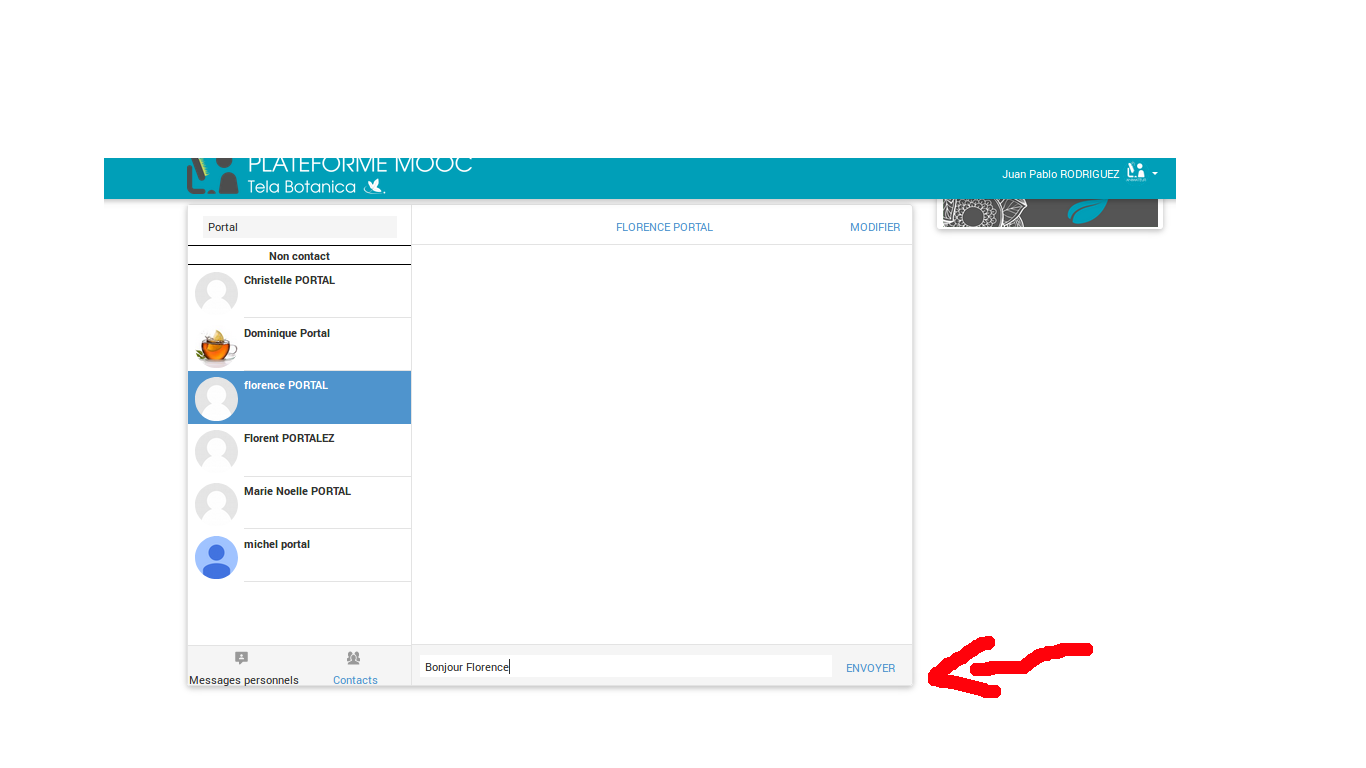 Une fois vous aurez selectionné la personne en question, vous pouvez lui écrire un message sur la fenêtre dédié au pied de la page.