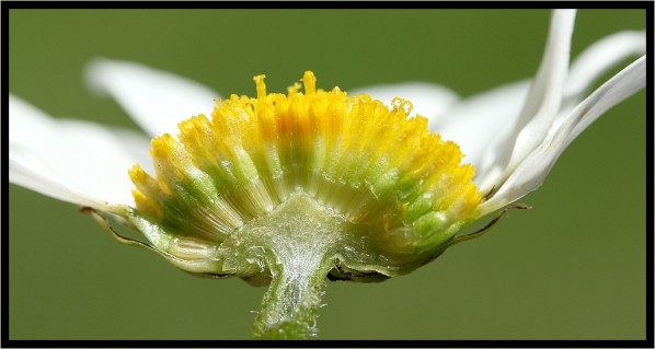 Je crois que les fleurs de la famille des Asteracées sont apparues par miniaturisation des ombelles de la famille des Apiacées (ombellifères). Les fleurs à 5 pétales qui composent les ombelles ont été obligées de se "serrer". Celles du milieu se sont transformées en fleurs tubulaires (jaunes chez la Marguerite). En les examinant avec une loupe on retrouve en haut du tube 5 petites dents qui rappellent les pétales. Les fleurs du pourtour qui, chez certaines ombellifères, sont déjà différentes de celles du milieu (par exemple chez les Berces les pétales vers l'extérieur sont plus grands que ceux tournés vers l'intérieur de l'ombelle) se sont transformées en fleurs ligulées. Sur les magnifiques fleurs bleues de la Chicorée, on retrouve les 5 petites dents au bout des ligules. Pour la Marguerite on parle d'hémiligules car il n'y a plus que 3 dents qui apparaissent.
