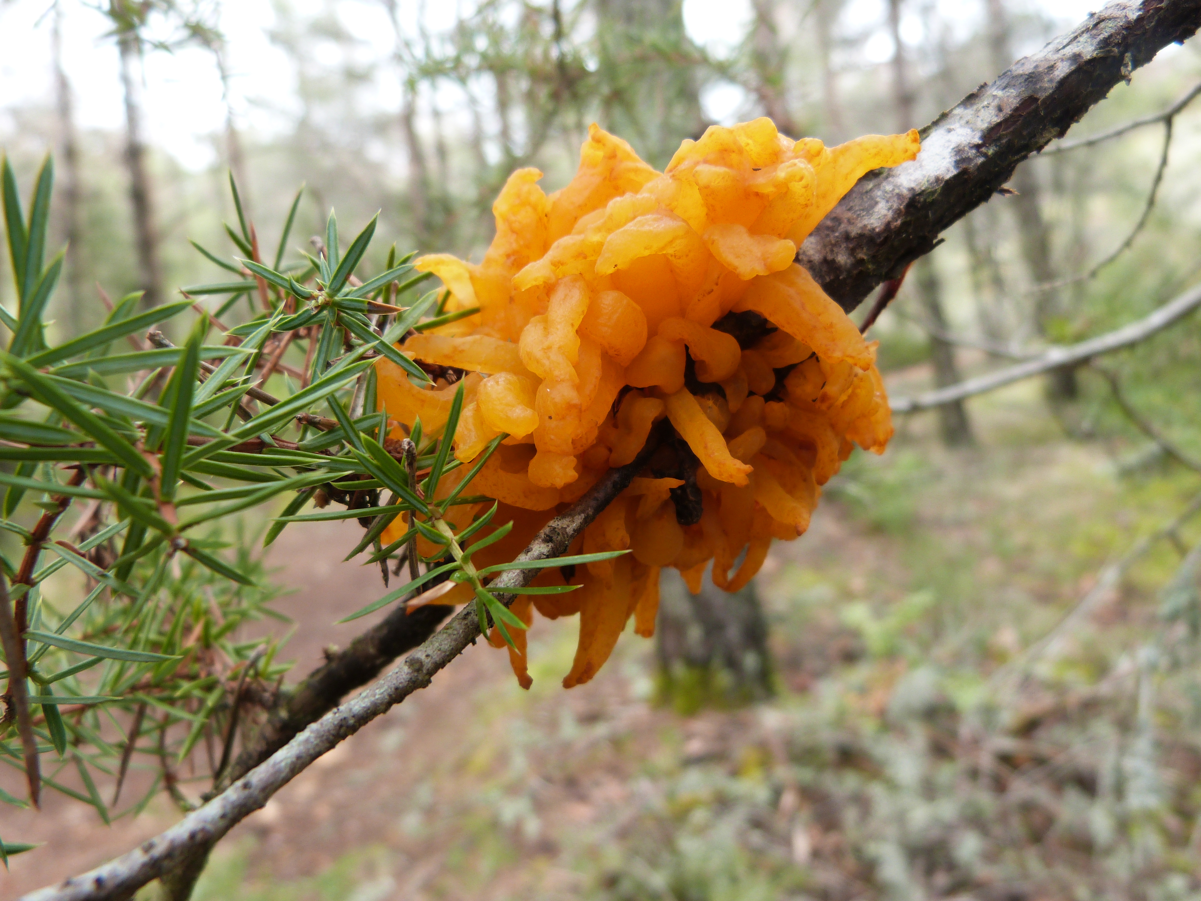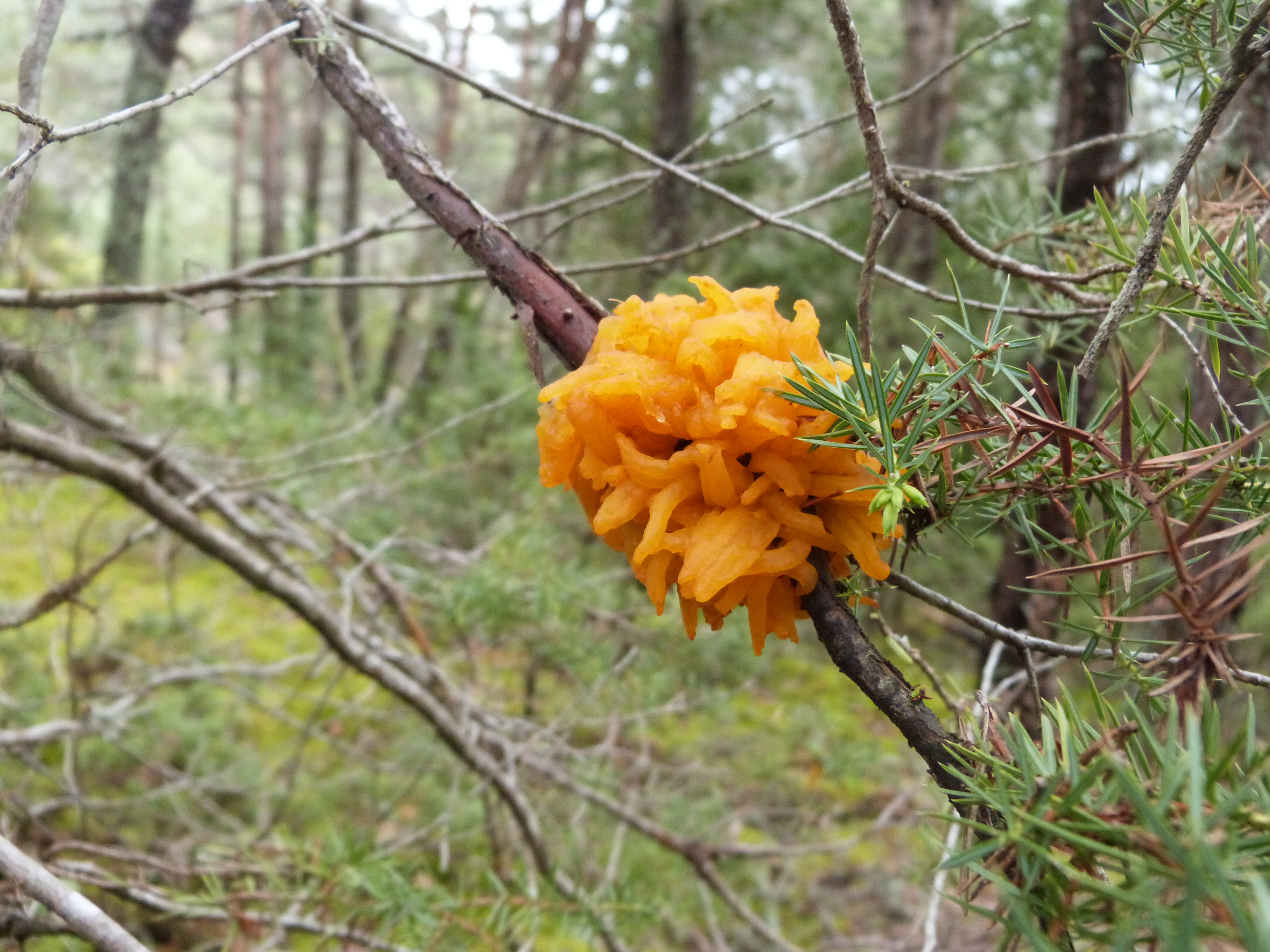 Alors c'est donc orange vif, c'est tout gluant et visqueux...et c'était accroché à un tout jeune pin...(j'en ai vu 2 autres comme ça un peu plus loin...)
