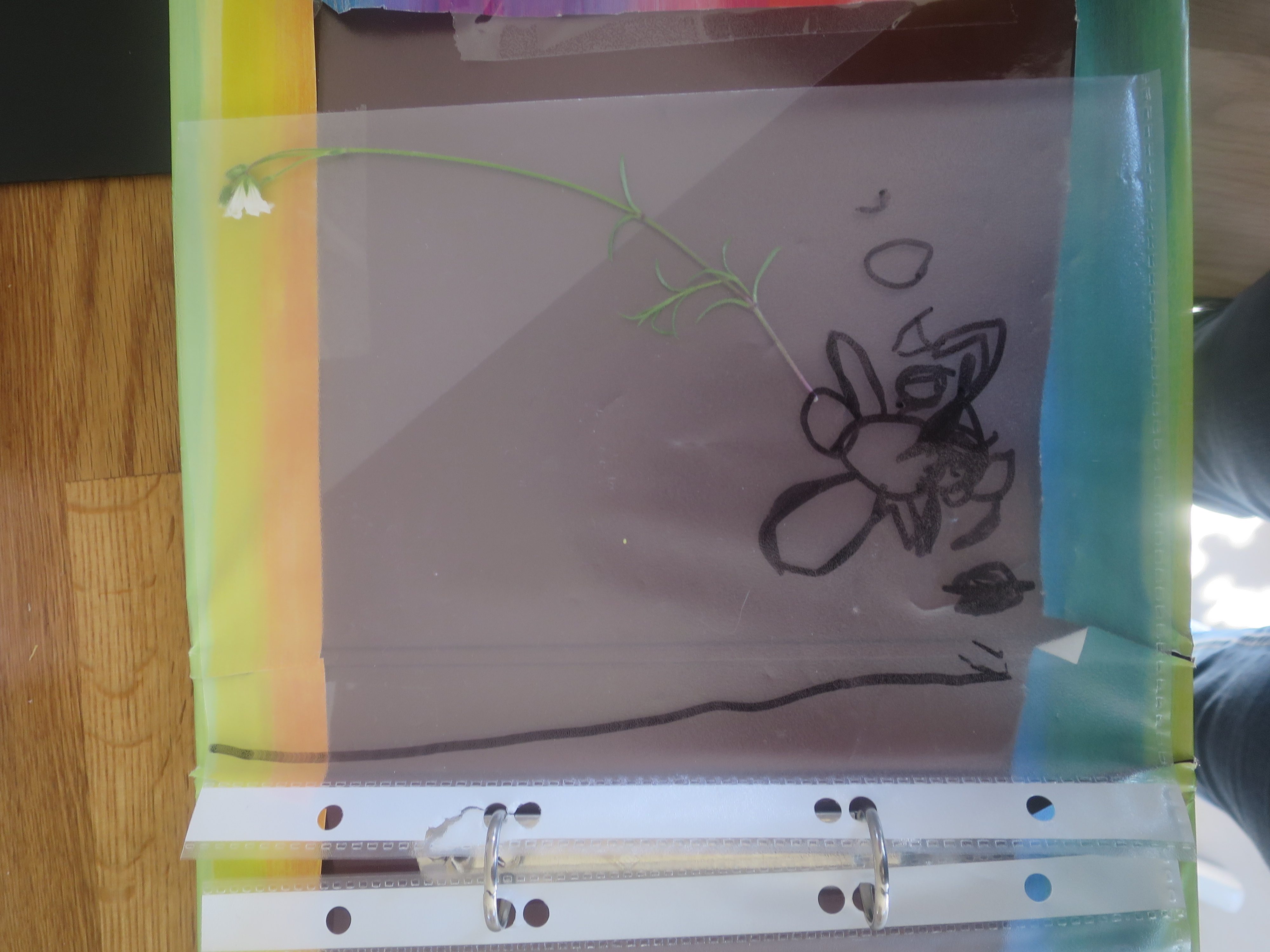 Je voulais vous partager aujourd'hui ce que ma fille de 4.5 ans à fait d'elle même. Lors d'une ballade je lui montre une fleur et lui montre le calice. Elle récolte 2 fleurs qu'elle trouvais jolies et en rentrant elle est partie au bureau et est revenue avec un classeur dans lequel elle y a mis les fleurs dans des housses plastiques différentes, y a dessiné les fleurs sur la housse et y a mis leur nom (elle ne sait pas encore écrire, mais a fait des vagues...