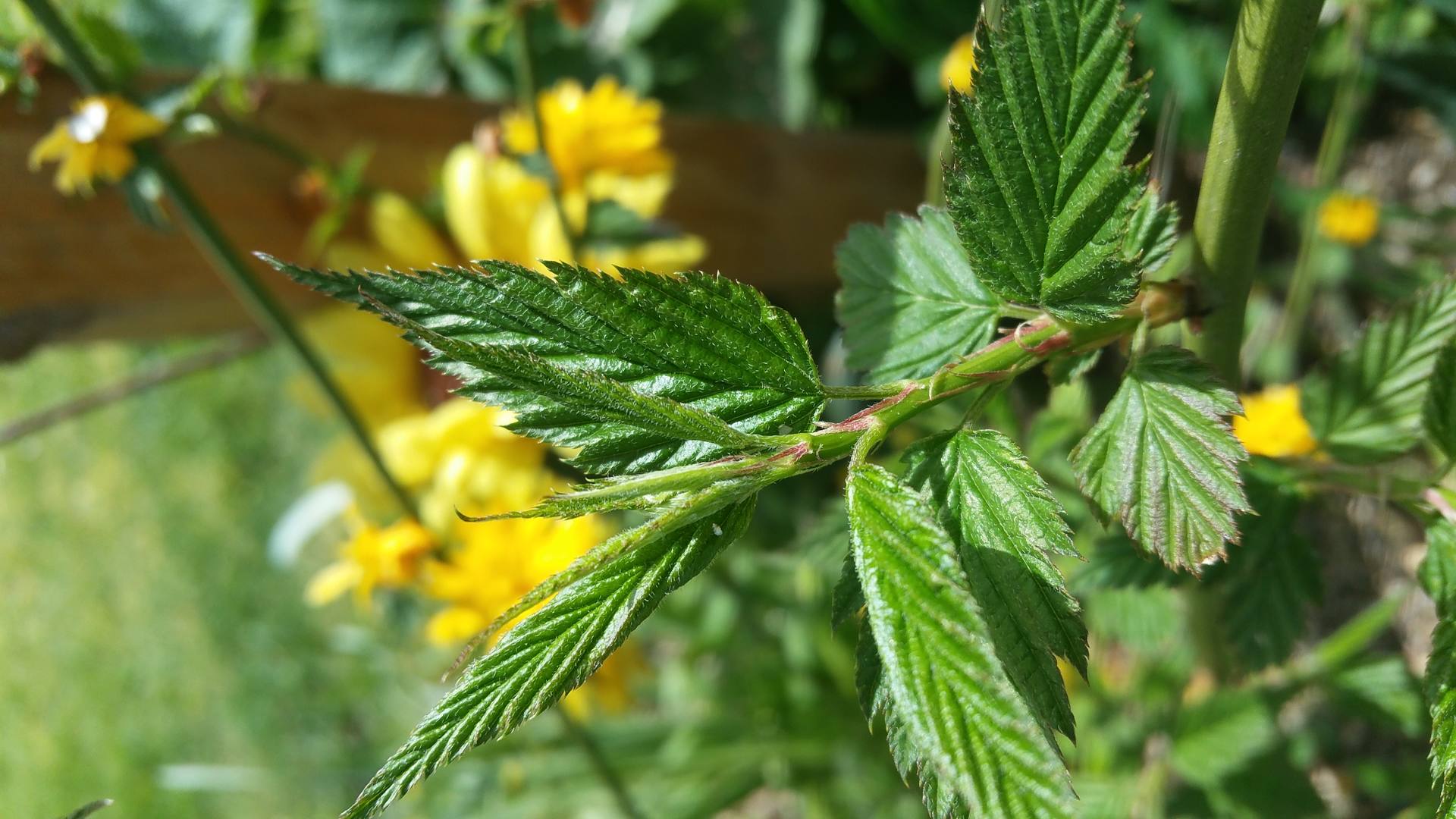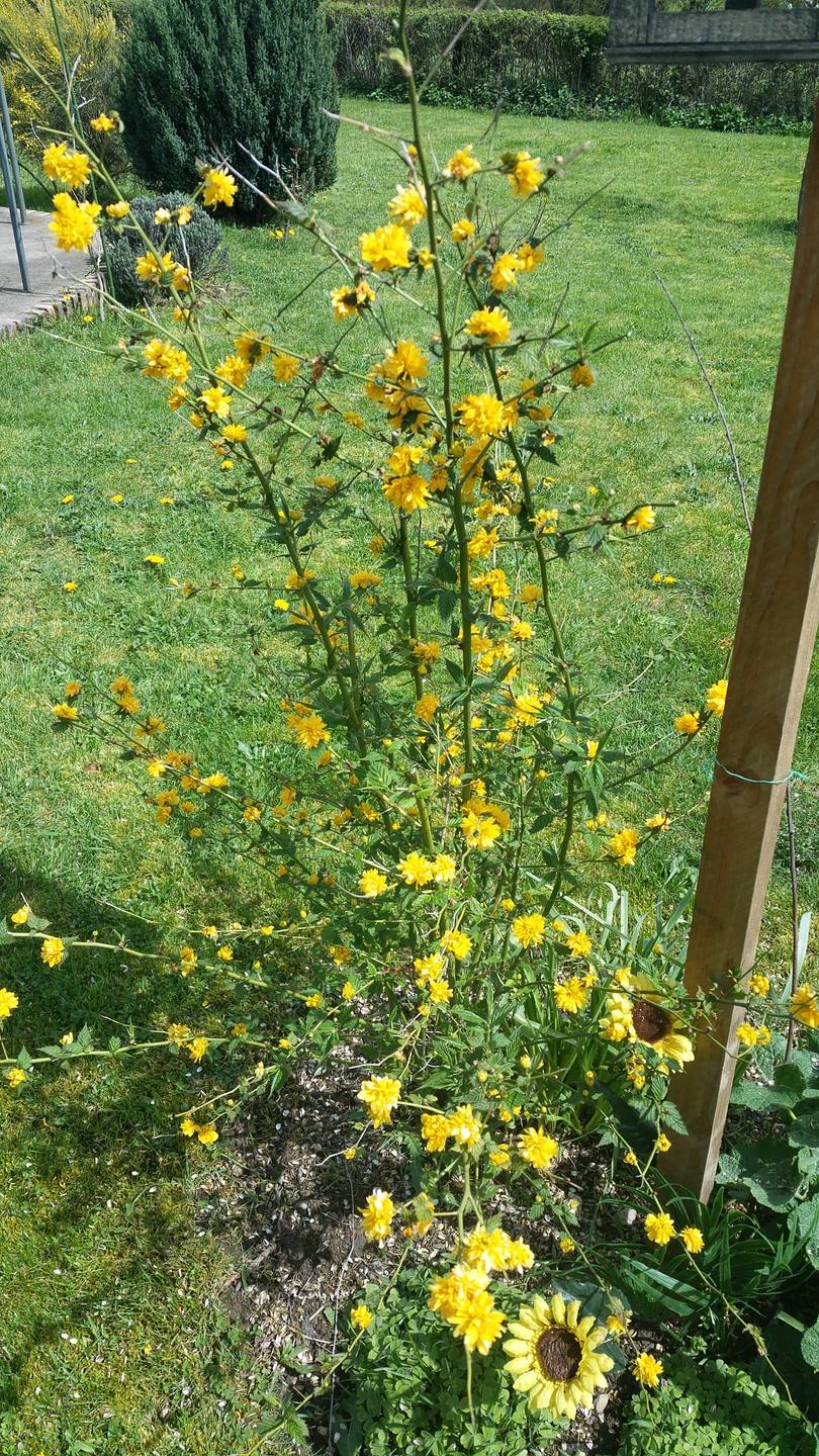 3 photos d'un petit arbuste "Corète du Japon" situé dans un jardin familiale dans l'Allier.