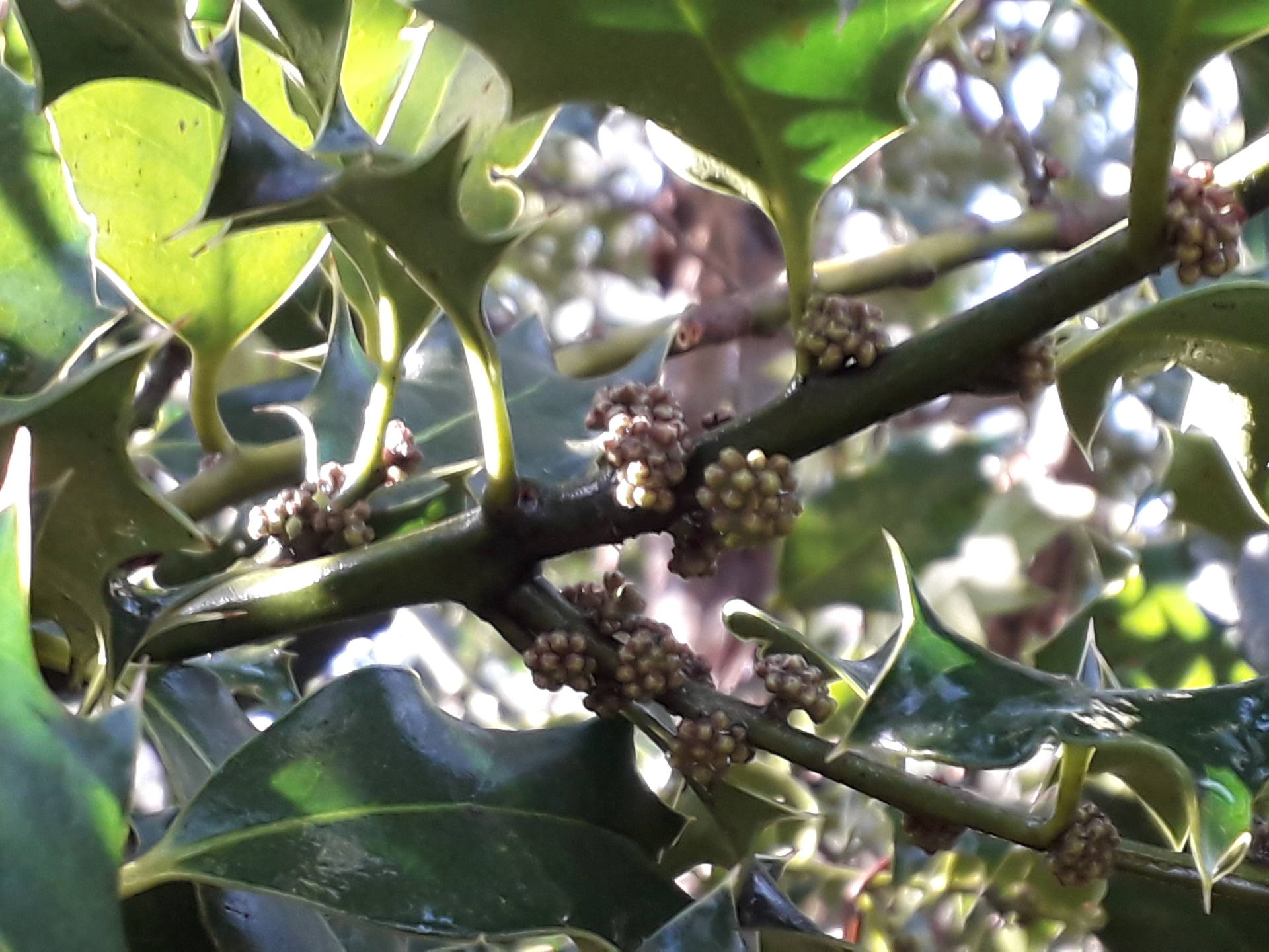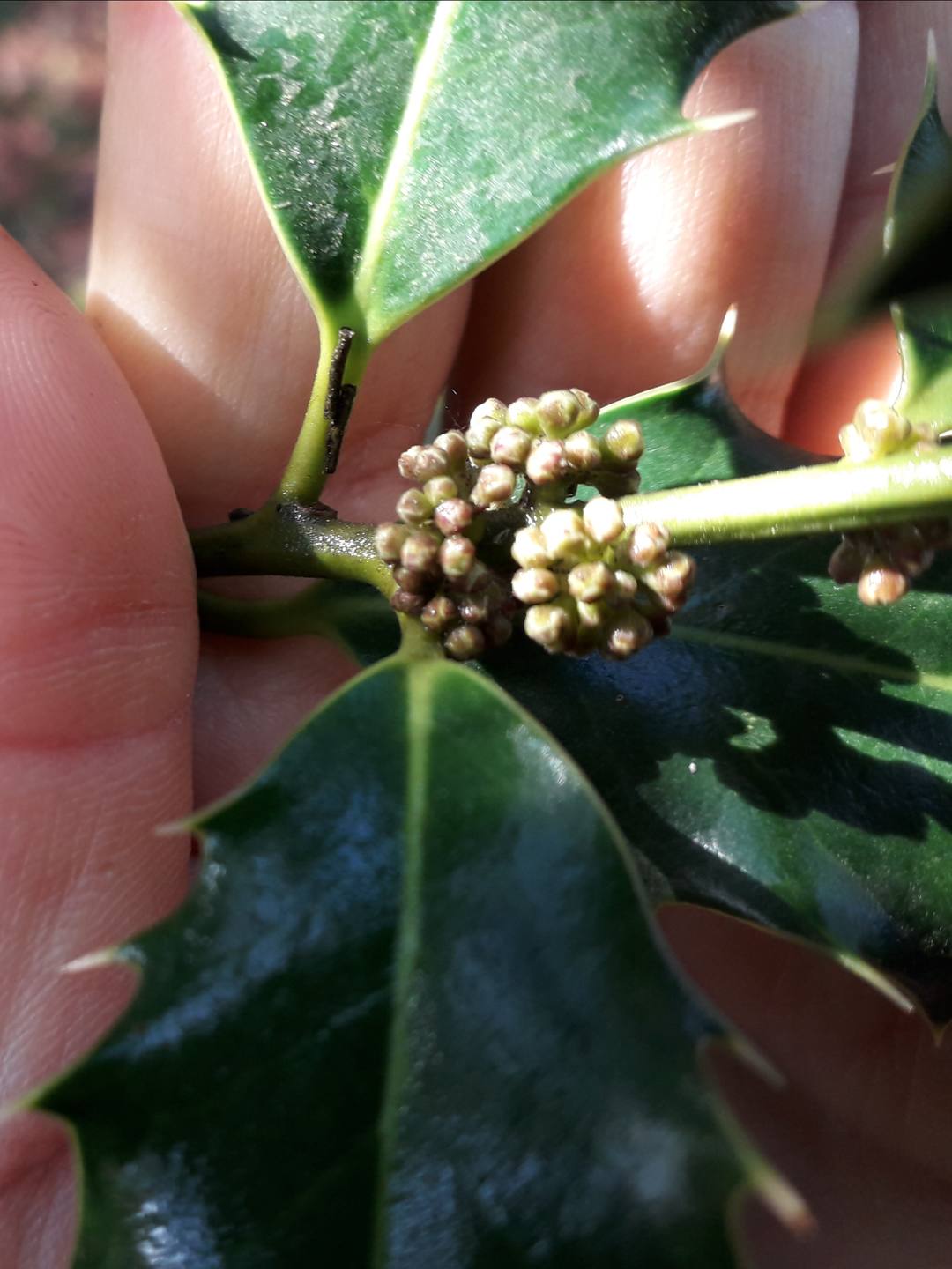20min de marche plus tard, je croise le chemin d'un autre houx... mais sur celui-là...pas de fruits... mais de petits fleurs regroupées en petites cymes (j'ai appris ce nouveau mot aujourd'hui aussi...). Par contre les fleurs n'étant pas ouvertes, je ne saurais dire si ce sont des fleurs mâles ou femelles...
