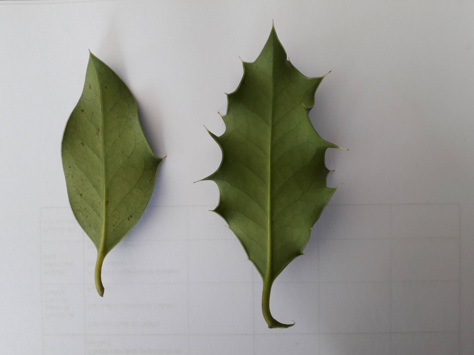 C'est une stratégie efficace pour éviter de se faire manger par les mammifères herbivores... plus on monte dans l'arbuste, plus c'est difficile pour le chevreuil d'attraper les feuilles et moins celles-ci ont besoin de se défendre...Waouhh...!! Et j'ai encore appris un nouveau mot... Le fait de posséder des feuilles de plusieurs formes est le phénomène d'hétérophyllie !