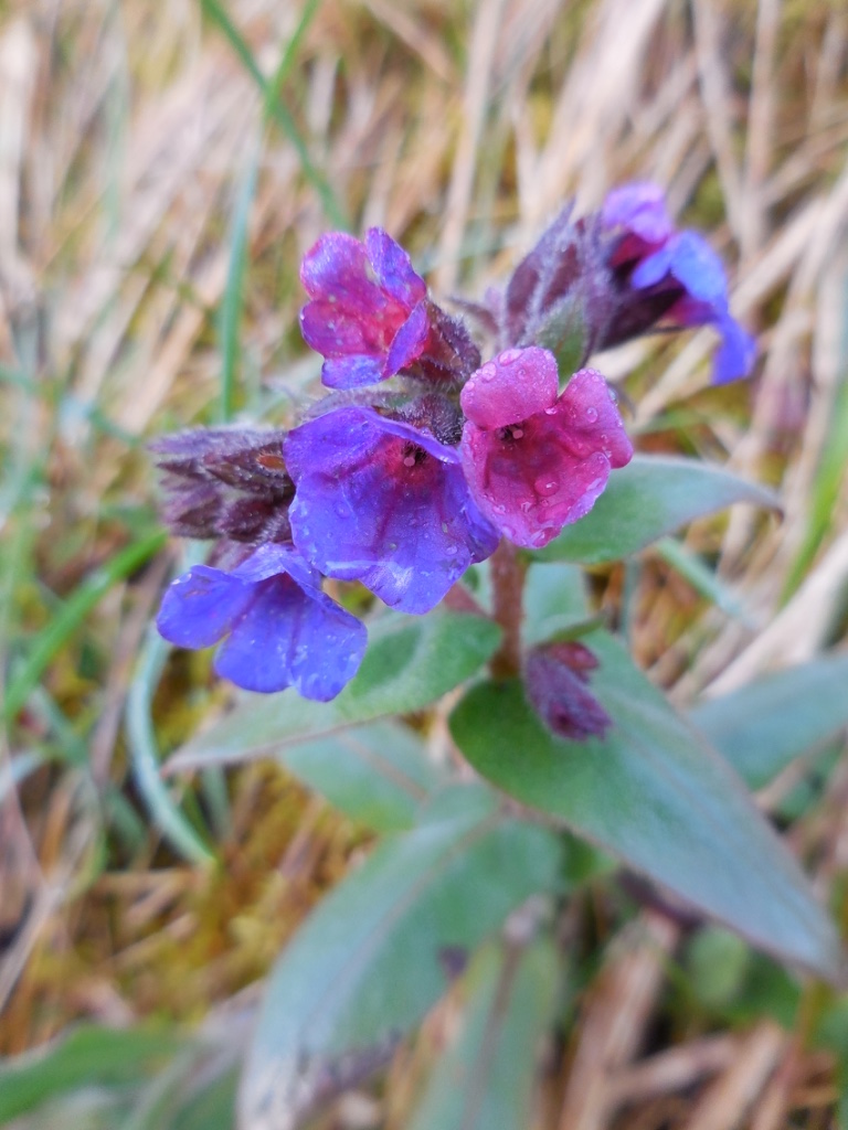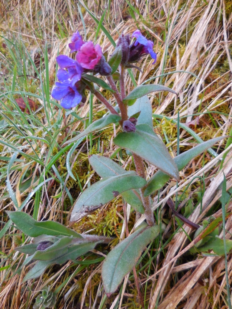 Photographiée dans l'Ain, samedi 31 mars 2018, sur un talus ombragé, à Mérignat, 450 m d'altitude, une jolie plante de 20 cm environ, aux fleurs bigarrées : sur un même plant, certaines sont roses, d'autres violettes et d'autres bleues... La tige est robuste, les feuilles sont velues. Est-ce bien une espèces de pulmonaire ? A priori les feuilles de certaines pulmonaires présentent des tâches blanches, ce n'est pas le cas de celle que j'ai photographiée.