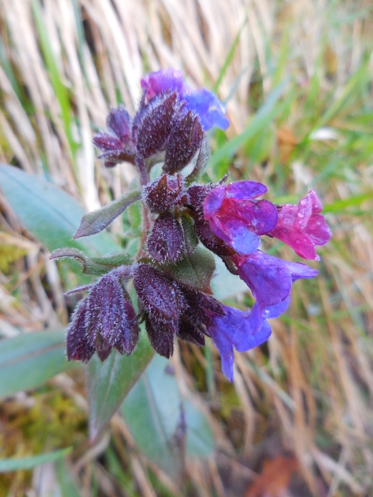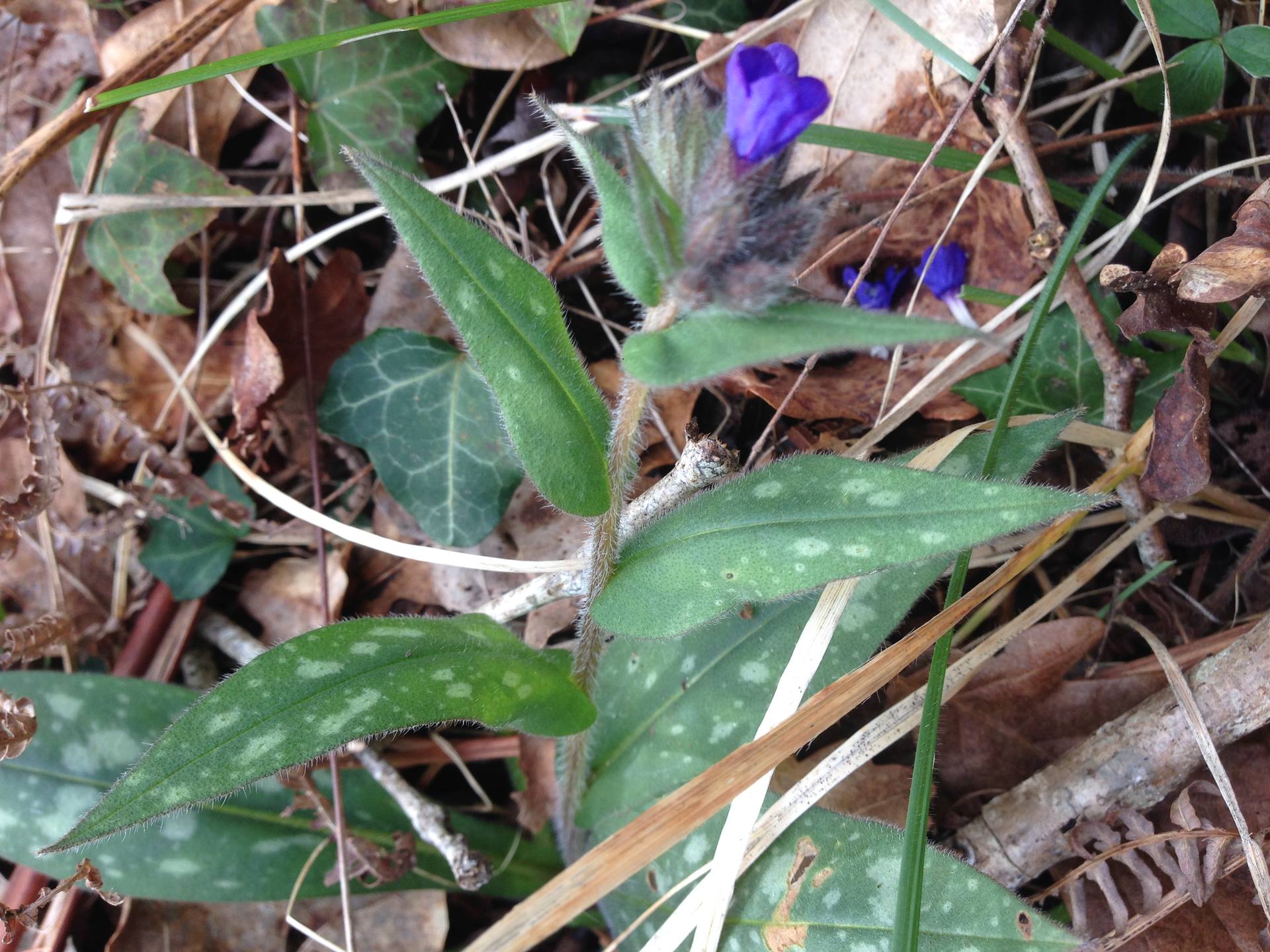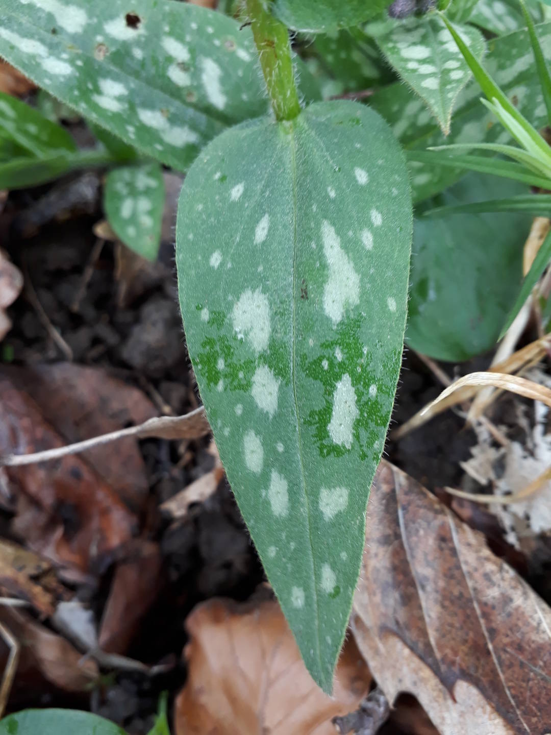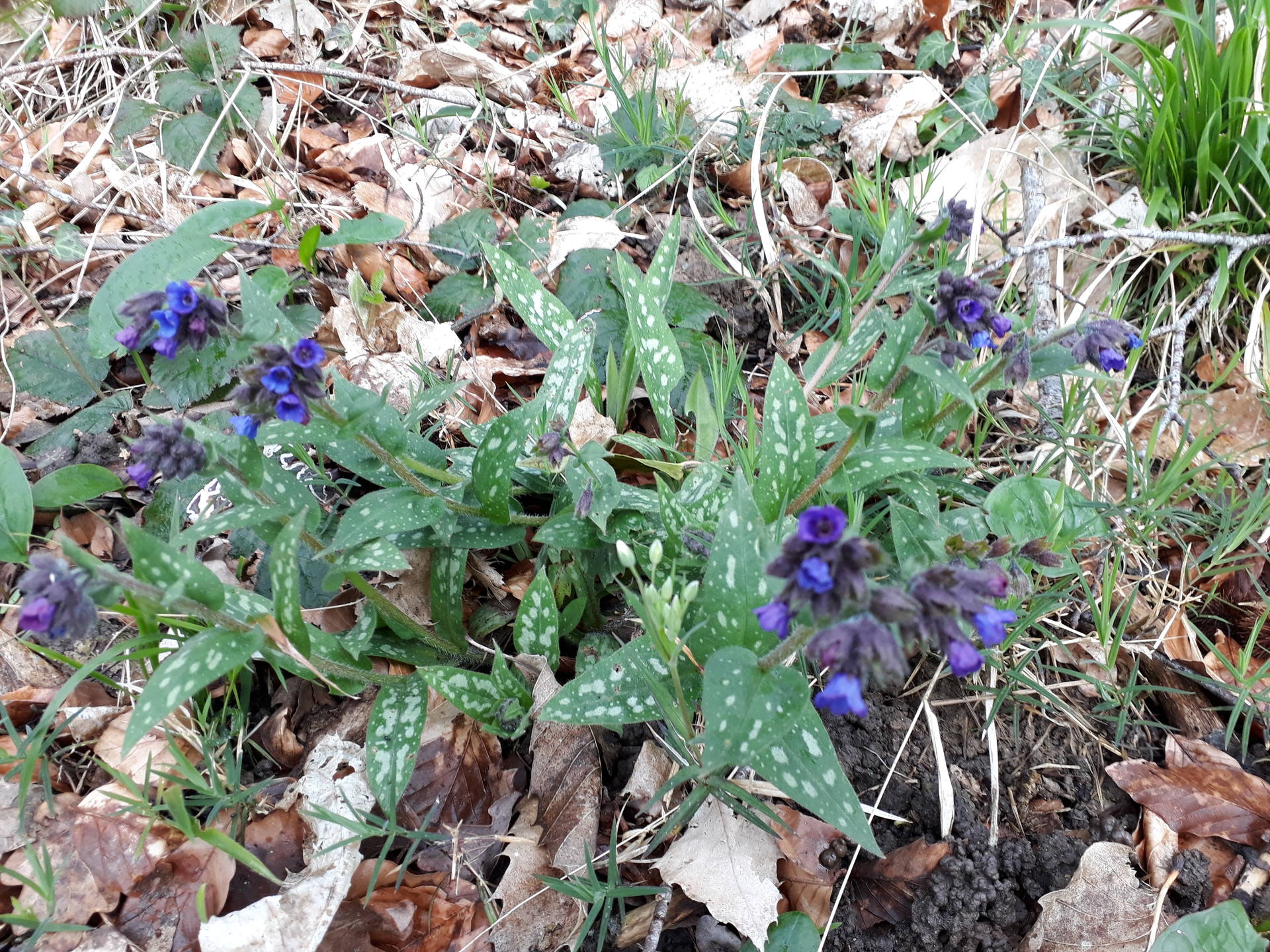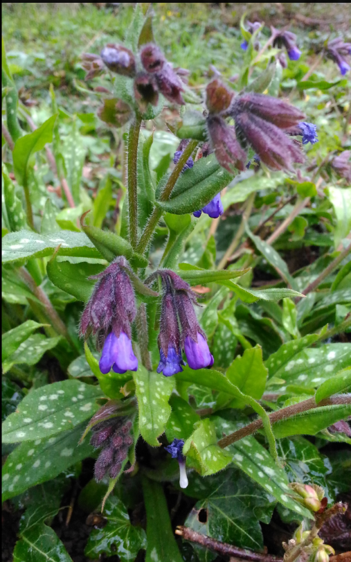 Fleurs roses à bleu-violet. Feuilles tachetées de blanc faisant penser à des poumons et autrefois utilisées comme remède contre les maladies pulmonaires;