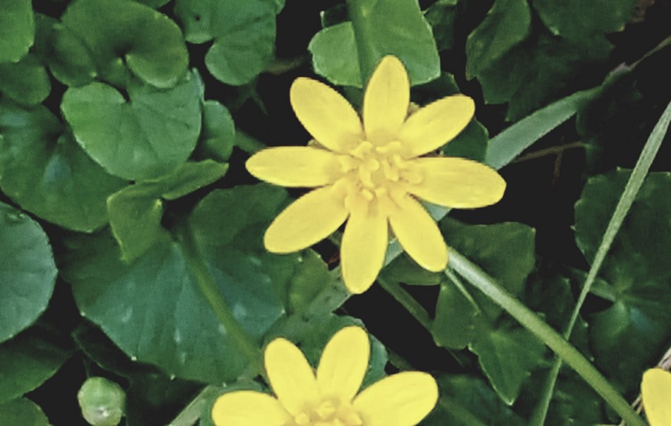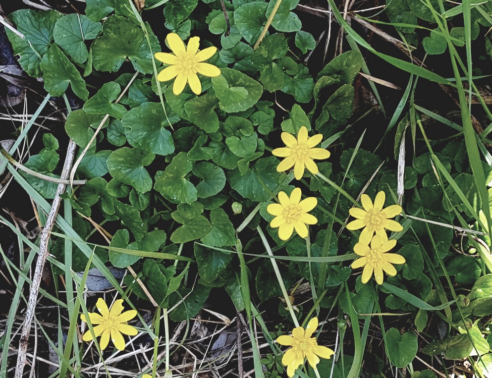 Petite fleur jaune, aux feuilles un peu épaisse et arrondies qui pousse tôt au printemps et couvre le sol d'une plate-bande de mon jardin, dans le nord de la Drôme.