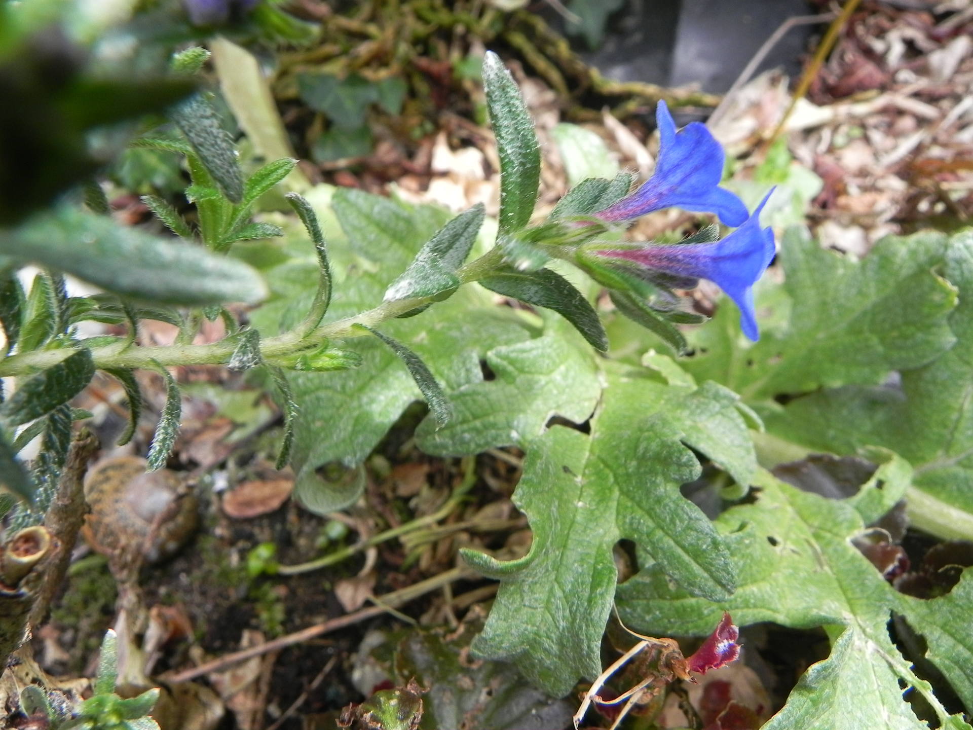 hier, chemin forêt landaise ; hauteur 25cm, feuilles vertes mouchetées de vert pâle/blanc, ovales lancéolées ; tige velue ; fleurs bleu-violacé en corolle campanulée (?) genre entonnoir, à 5 pétales soudés...