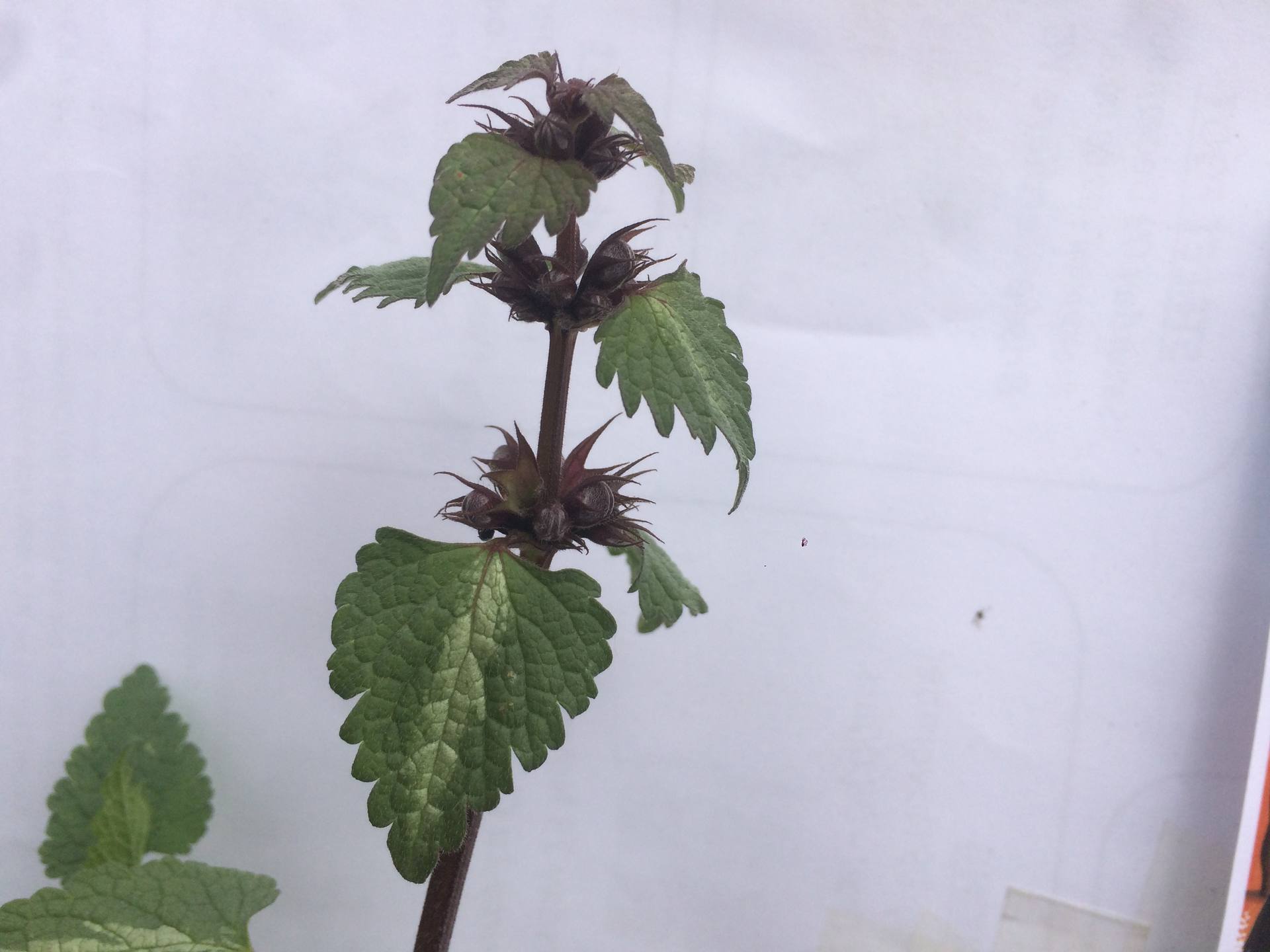 Aspects remarquables : Feuilles velues, vertes à la base de la tige et virant au violet en se rapprochant du haut de la tige. La tige est carrée, relativement épaisse, et également velue.