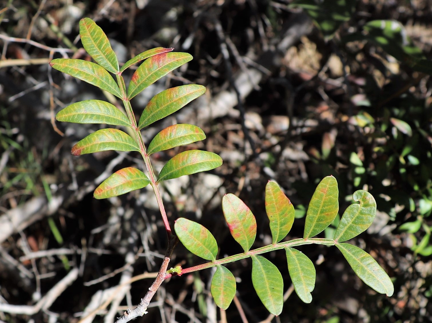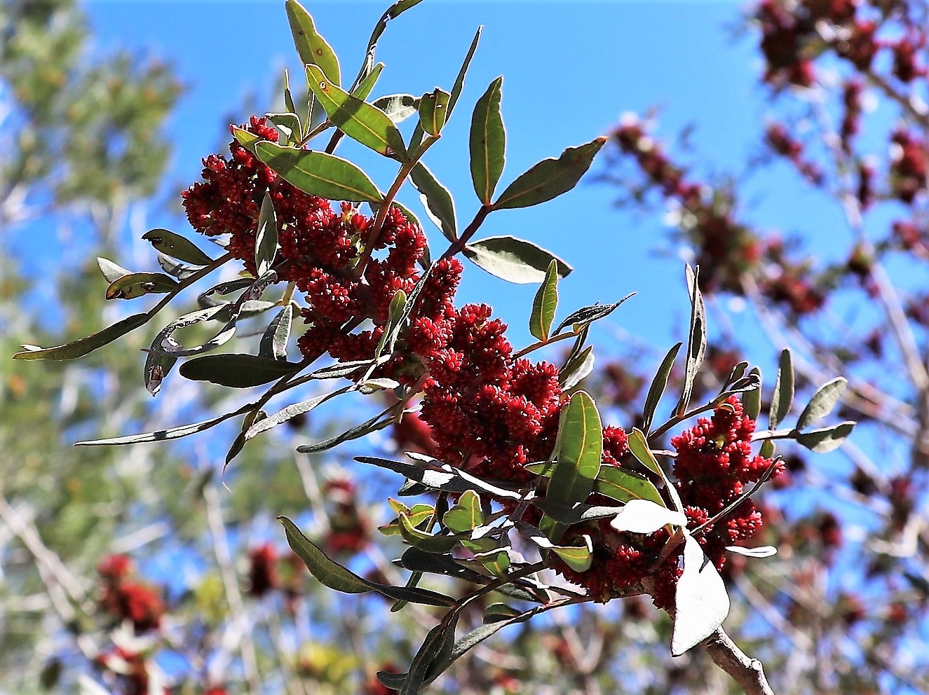 Arbrisseau fréquent dans les calanques de Marseille. Feuilles composées de folioles en nombre pair. Fleurs rouges (males) en grappeLentisque pistachier vue d'ensemble