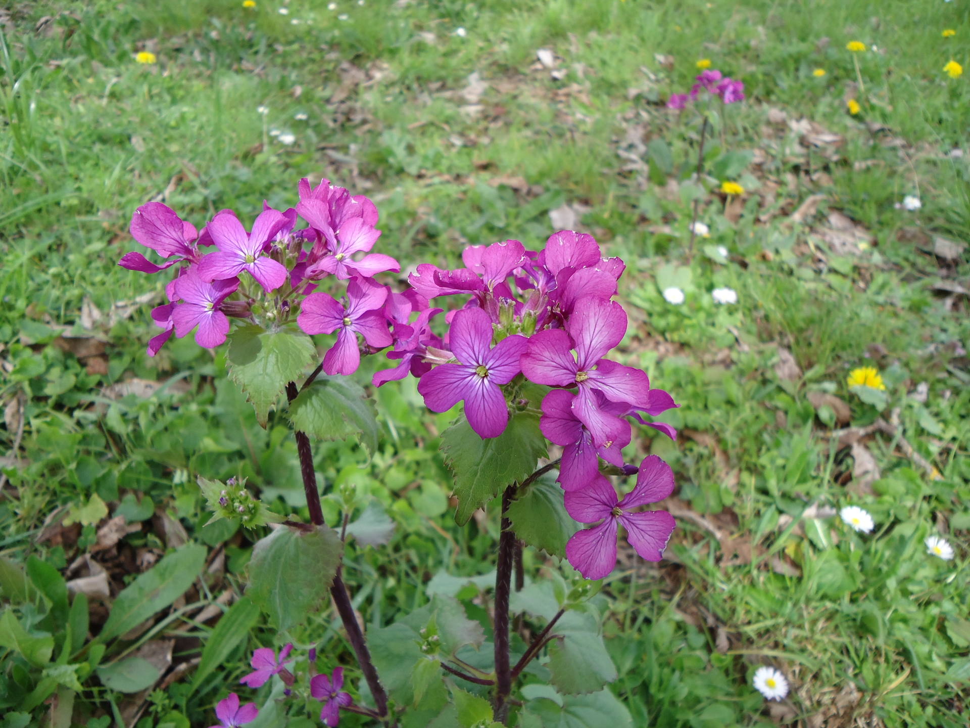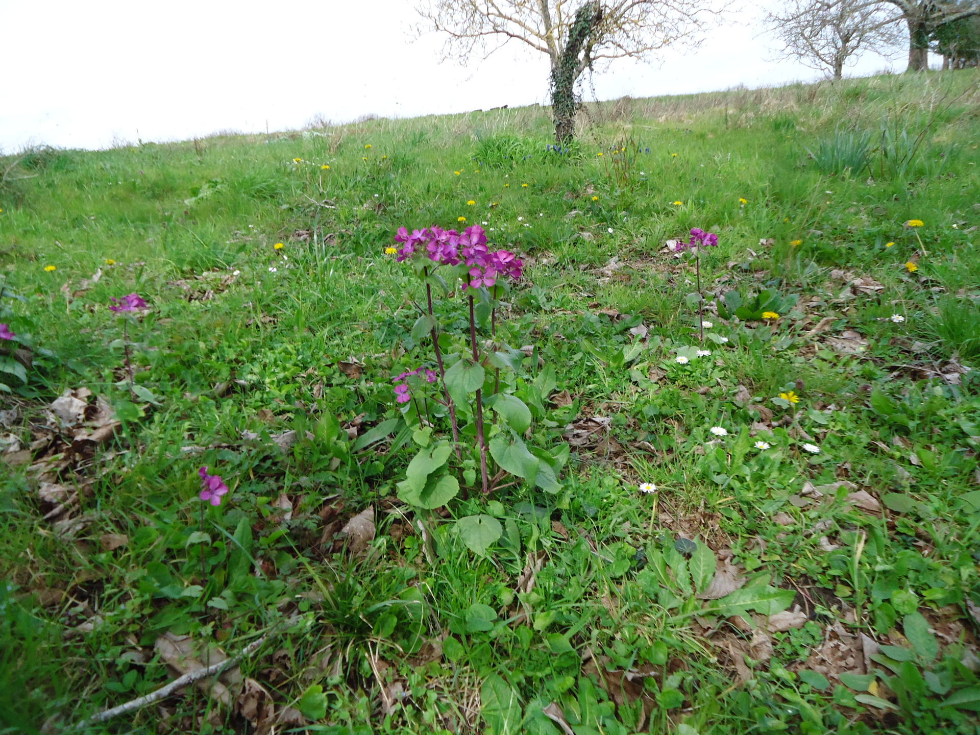Cette monnaie du pape-ci (Lunaire annuelle - Lunaria) pousse sous un noyer, mais il y en a une multitude ailleurs que sous cet arbre, aussi bien au pied de lilas, qu'un peu plus épars alentour.