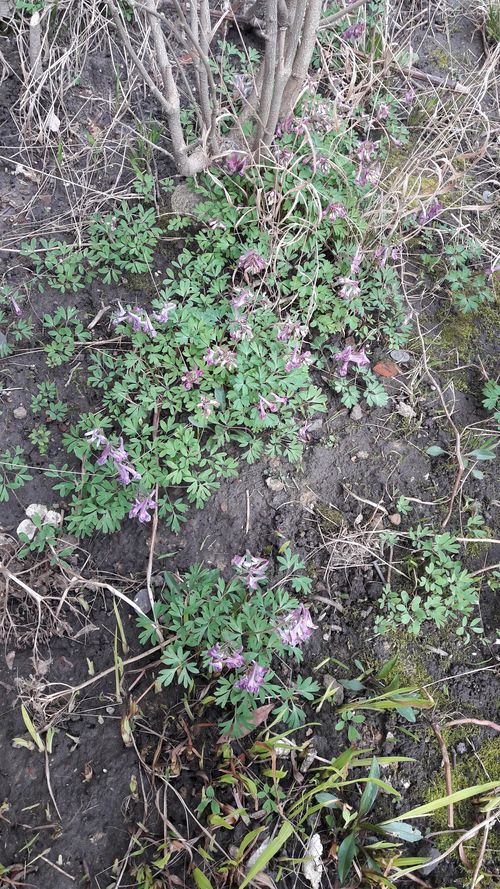 La corydale à bulbe plein .... j'ignorais il y a quelques jours encore son nom à cette fleur de mon jardin que je voyais comme une mauvaise herbe plutôt envahissantel; elle pousse librement dans mon jardin ombragé de la ville. Elle se multiplie facilement comme la montre la vue d'ensemble.  En s'étendant, de proche en proche formant de petits massifs sous des buissons, ou isolées.