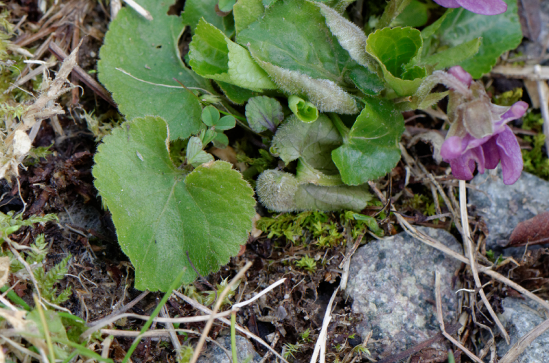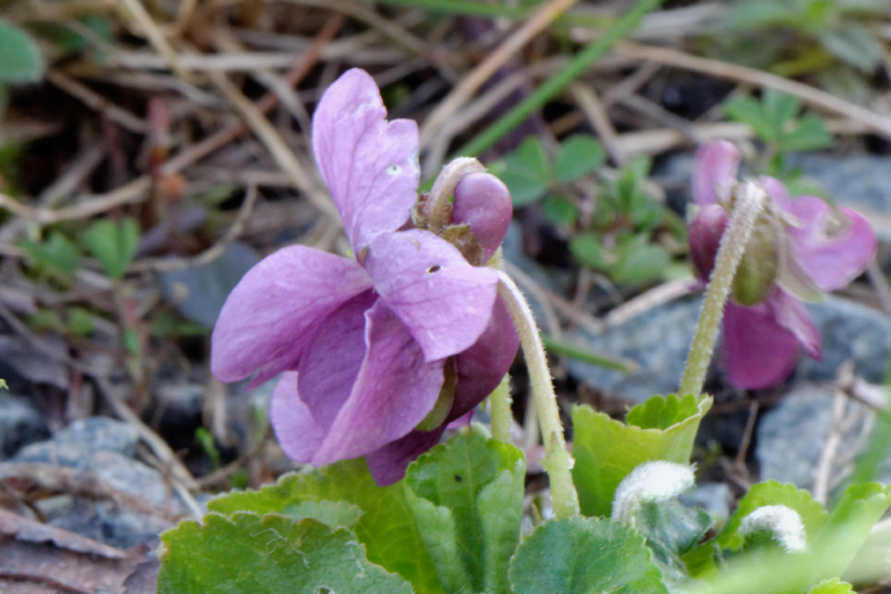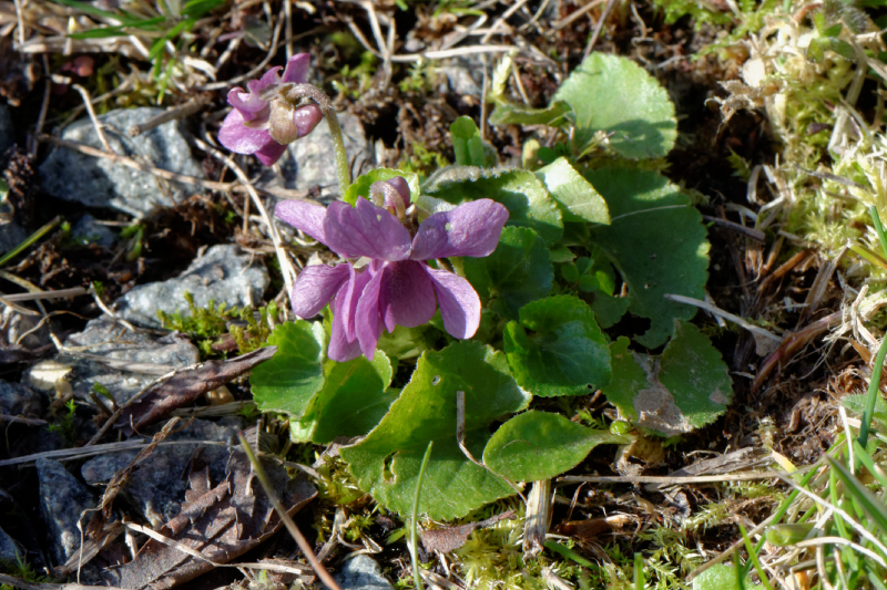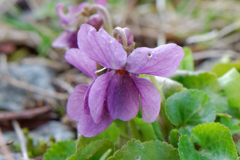 Celle-ci, c'est Viola odorata, la violette odorante (mais celle-ci ne sent rien ???).  Sa fleur a un goût très très légèrement sucré... Selon Wikipédia, elle a de nombreuses vertus médicinales. C'est une plante vivace, qui fleurit de février à mai, et forme des colonies. On la trouve dans les bois, les prés, les haies...