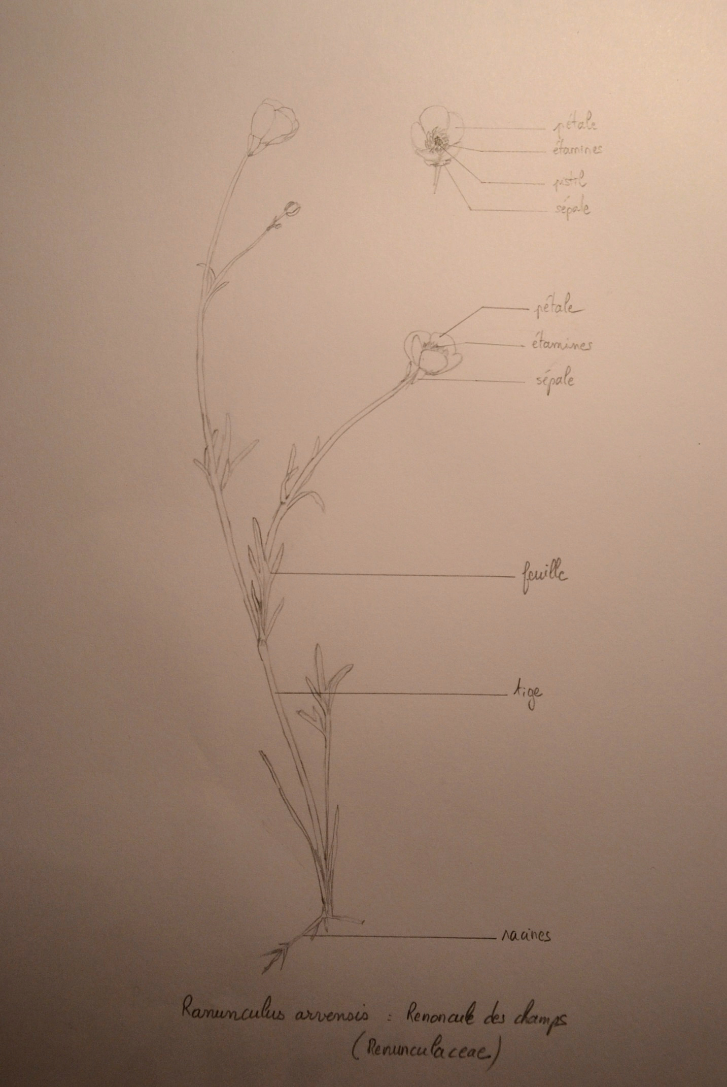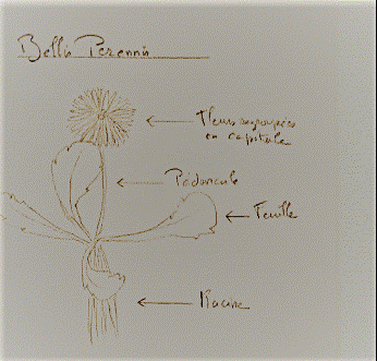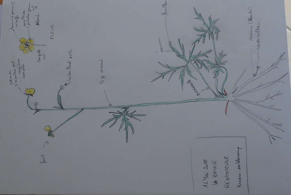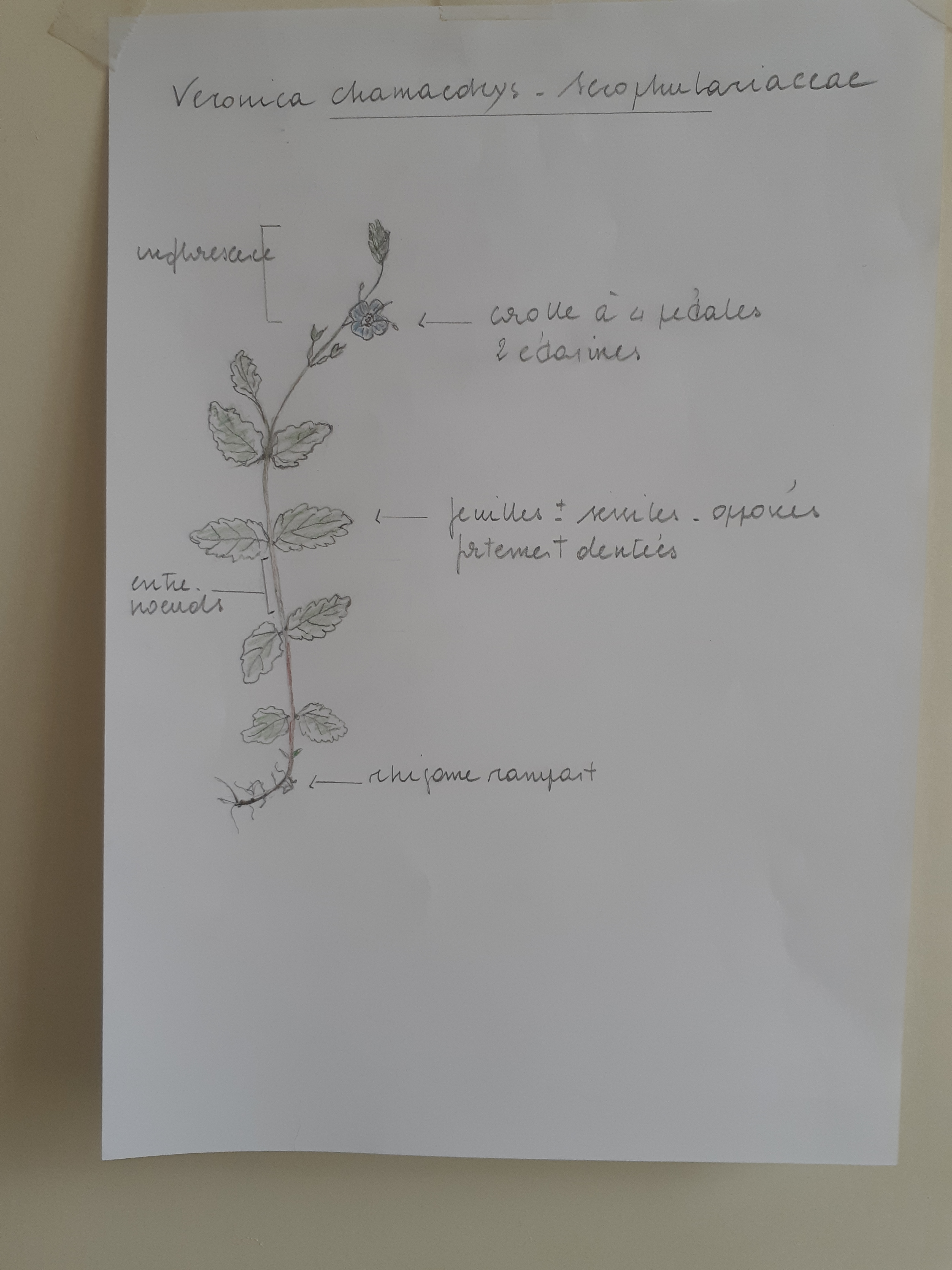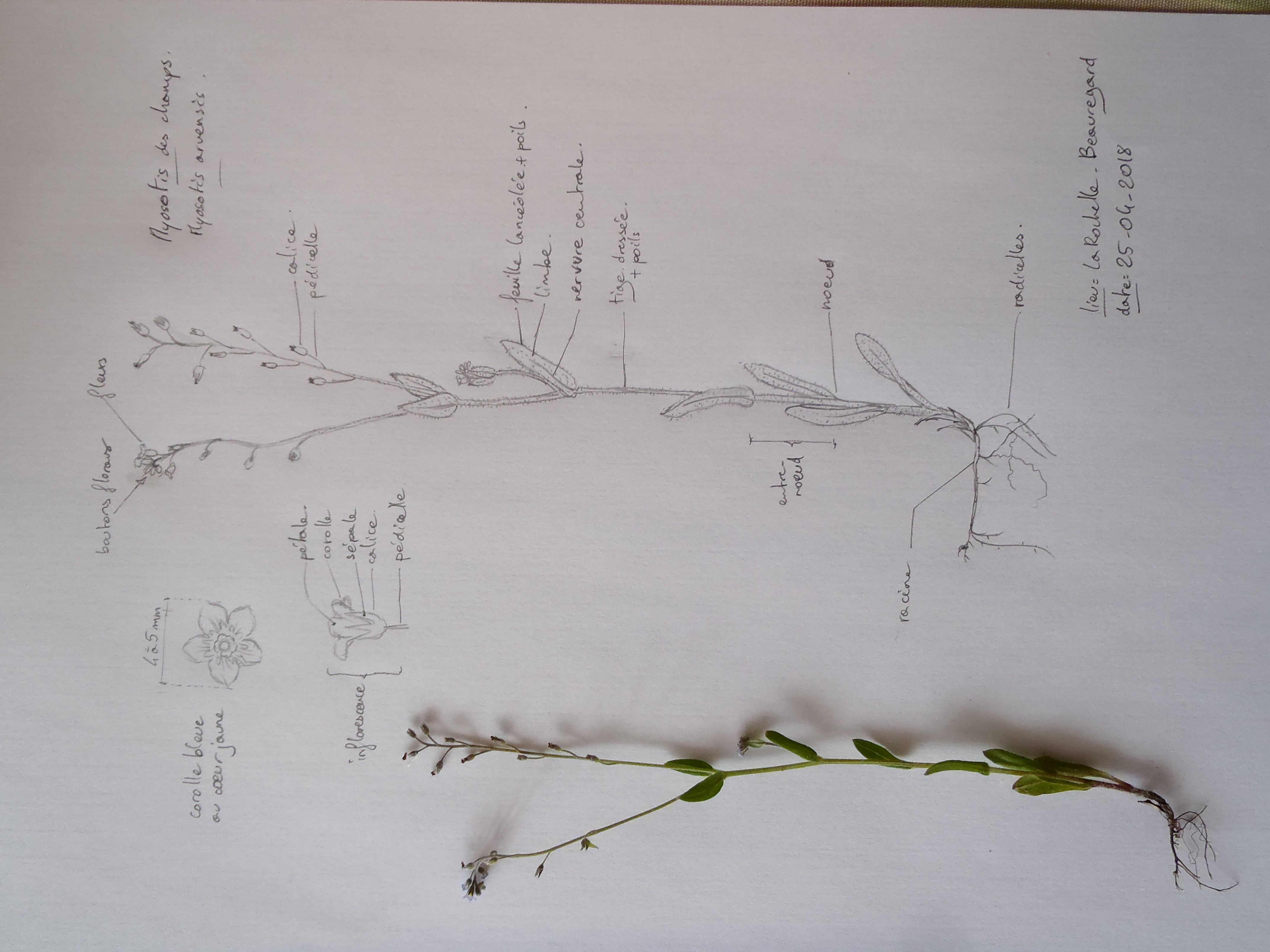 Premier problème : trouver LA plante, pas trop difficile à prélever complète (les racines...) ni à dessiner (structure 3D simple, pour commencer...), pas trop grande, fleurie... En attendant d'en trouver une qui convienne, je suis aller désherber mon potager. Et là, dans le carré de fraises, des myosotis (parmi beaucoup d'autres adventices issues de l’exubérance printanière...). Dont voici un représentant, pas vraiment détaillé par des mots au bout de flèches, mais avec annotations. Ça fait pas encore scientifique, mais je m'y mettrai... C'est un dessin à la main colorié ensuite avec l'ordi'.