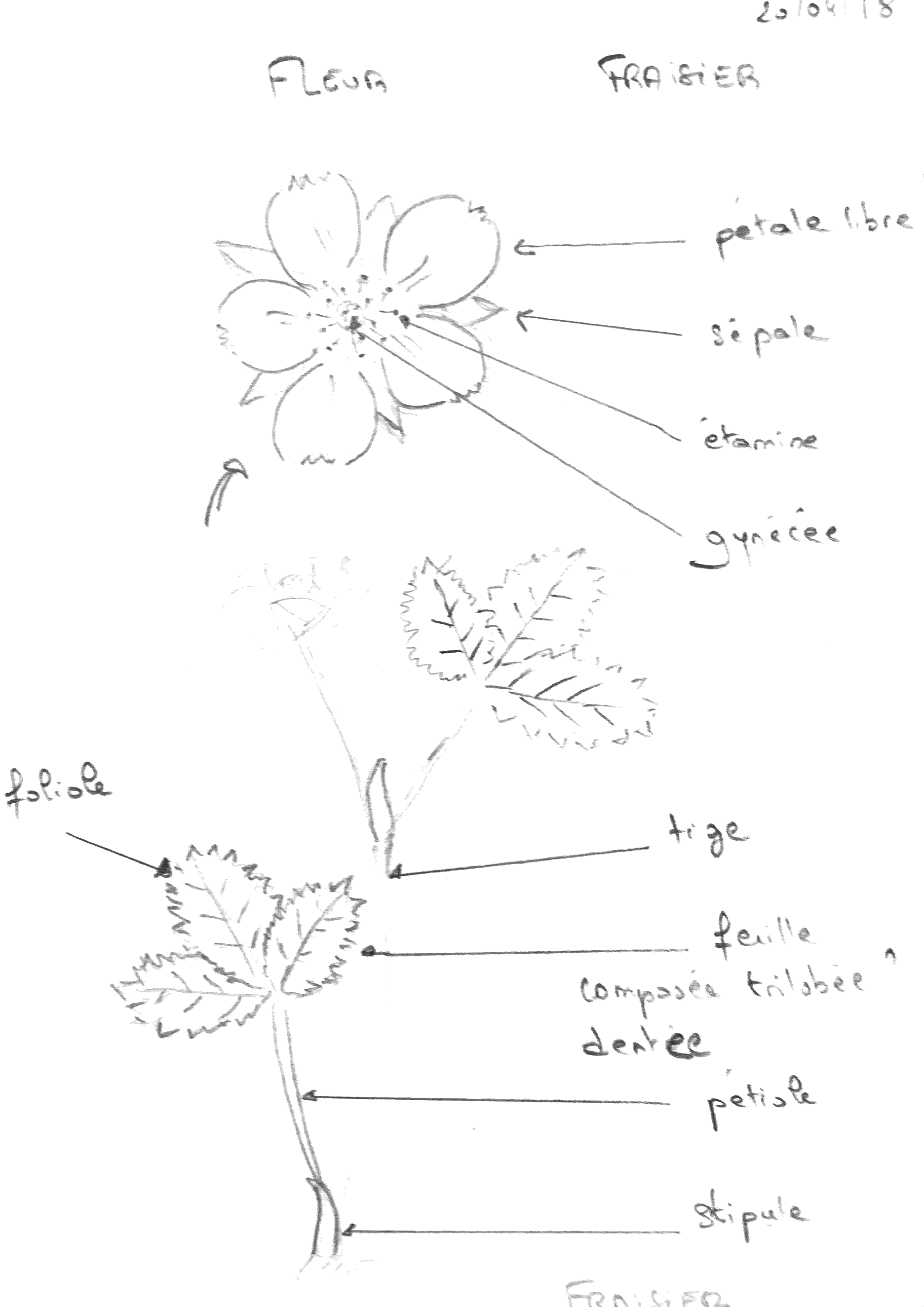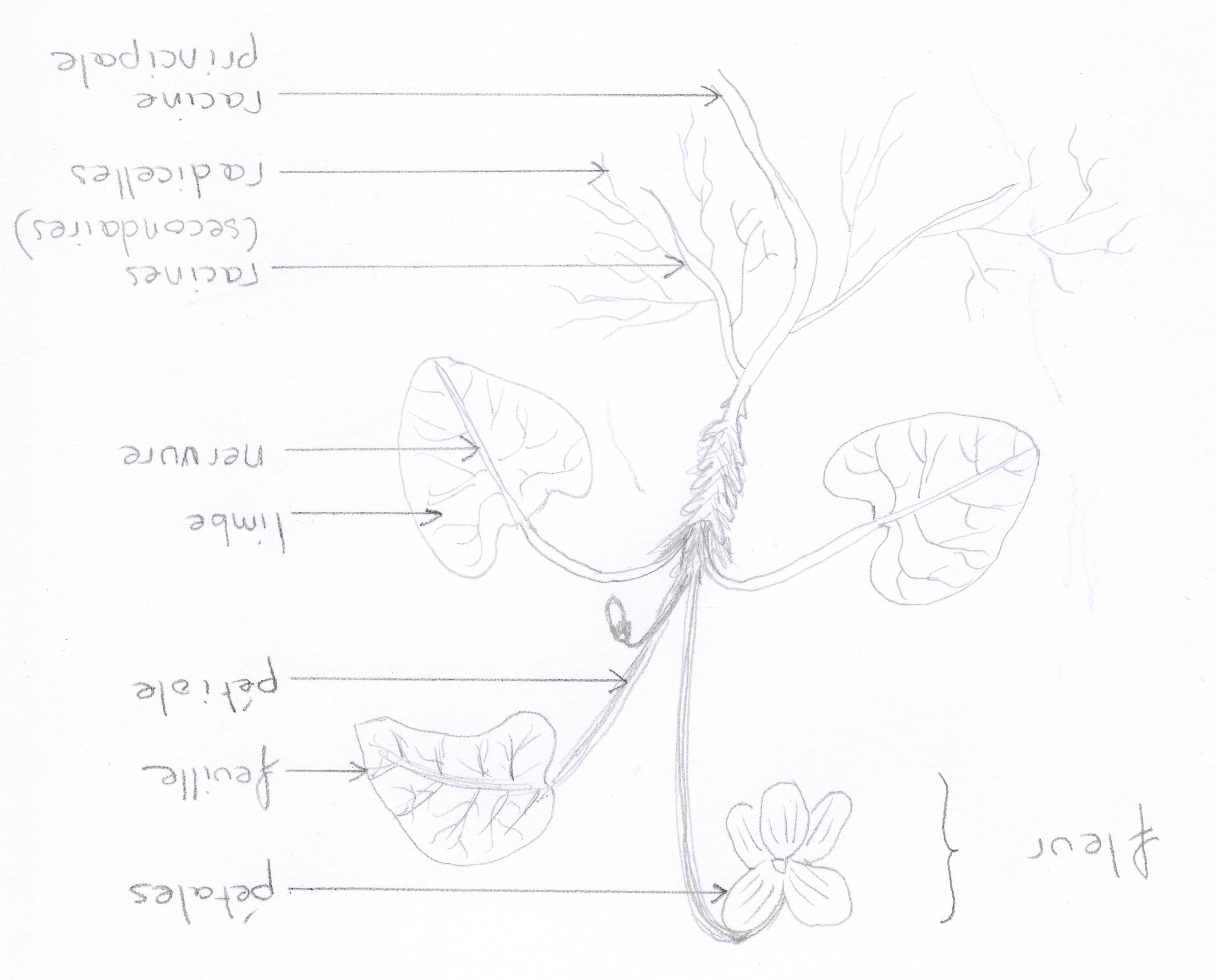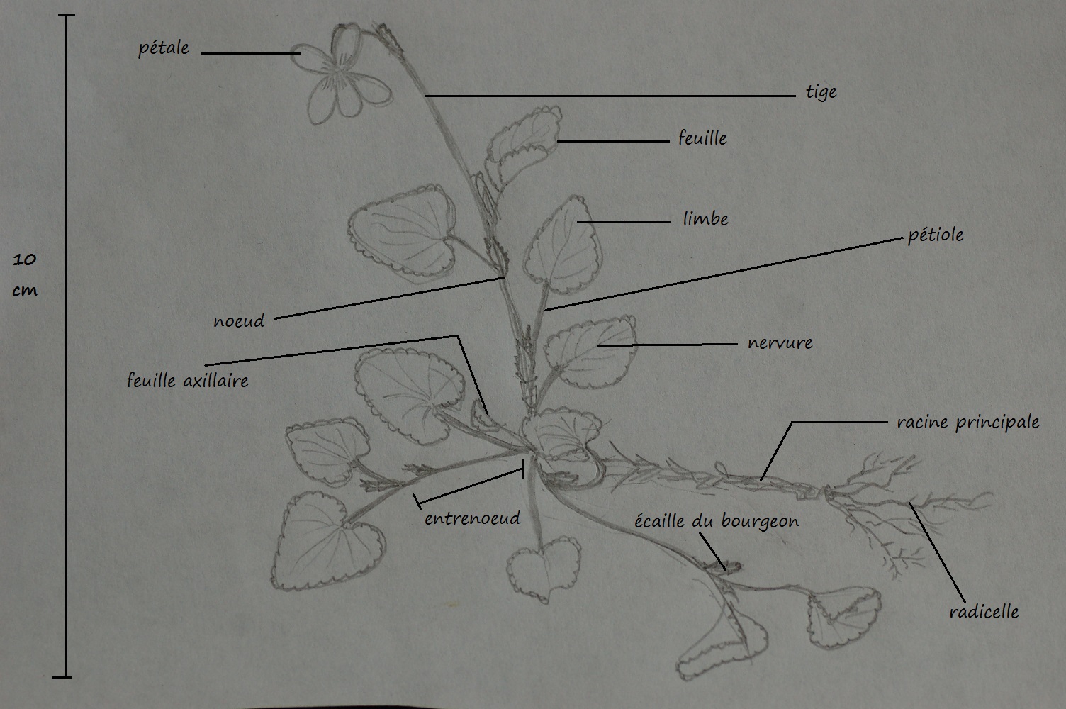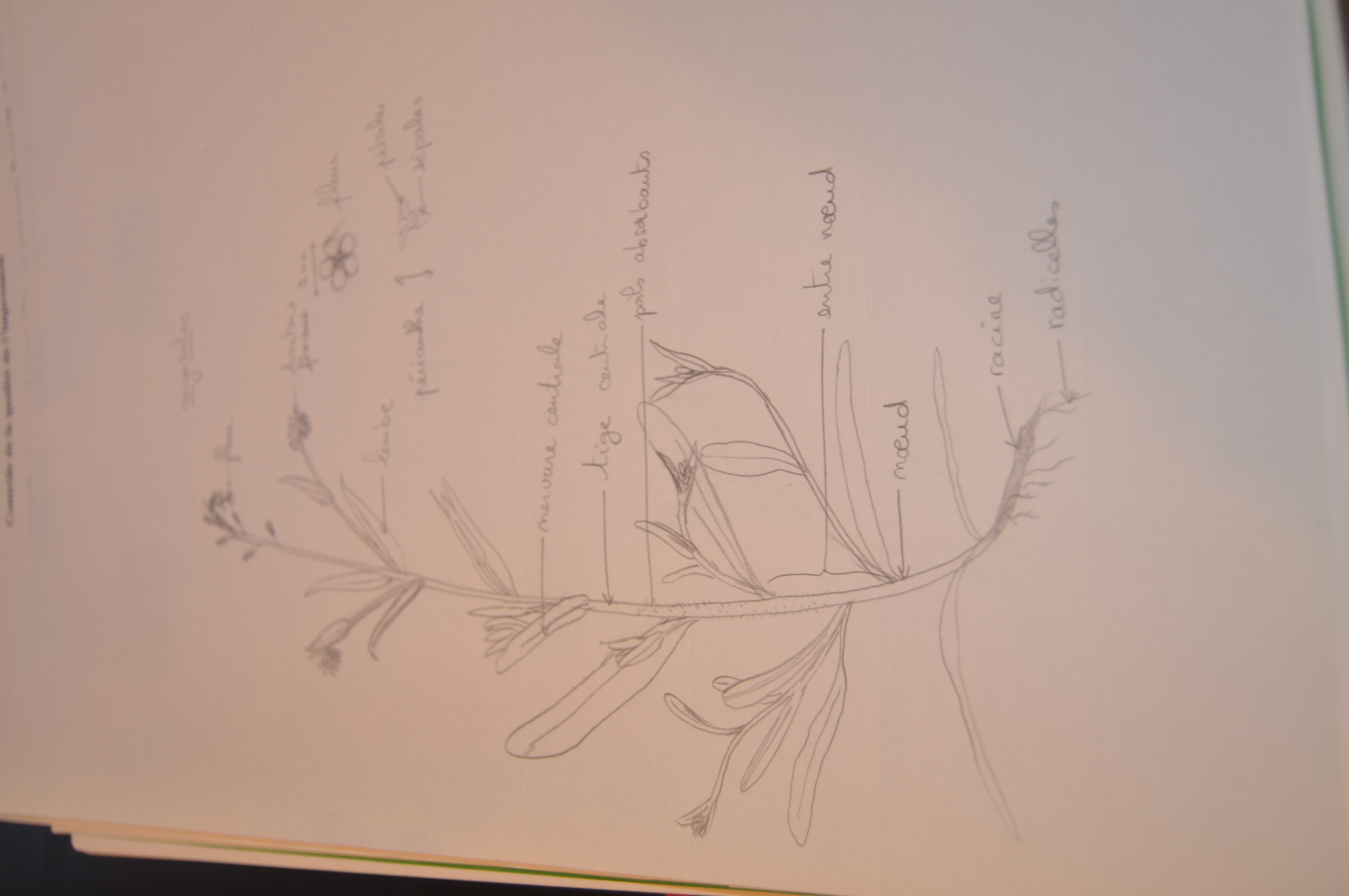 Je constate que les proportions de la plante entière et des feuilles et fleurs ne correspondent pas complètement ; les feuilles et fleurs sont relativement trop grand dans mon dessin