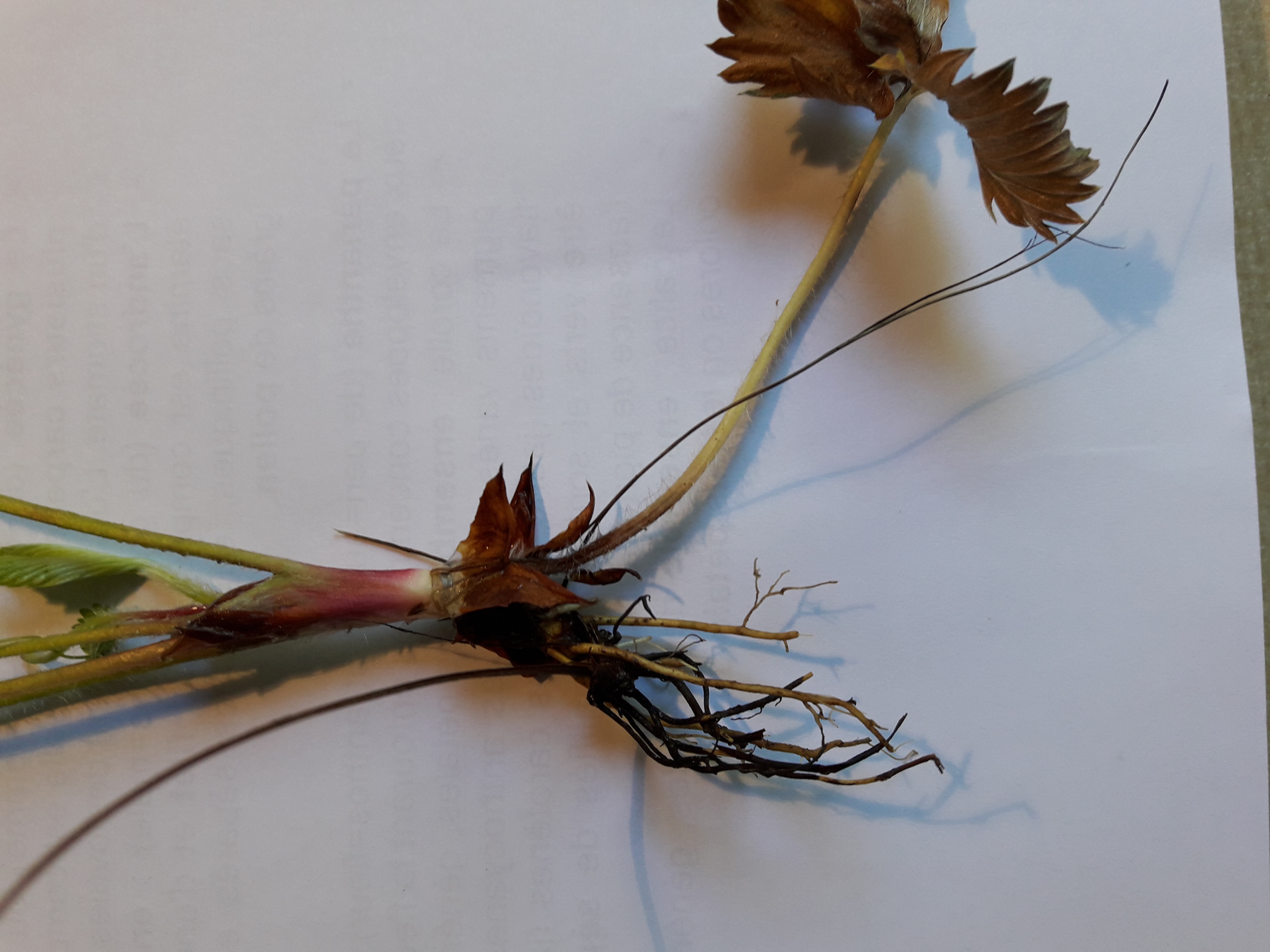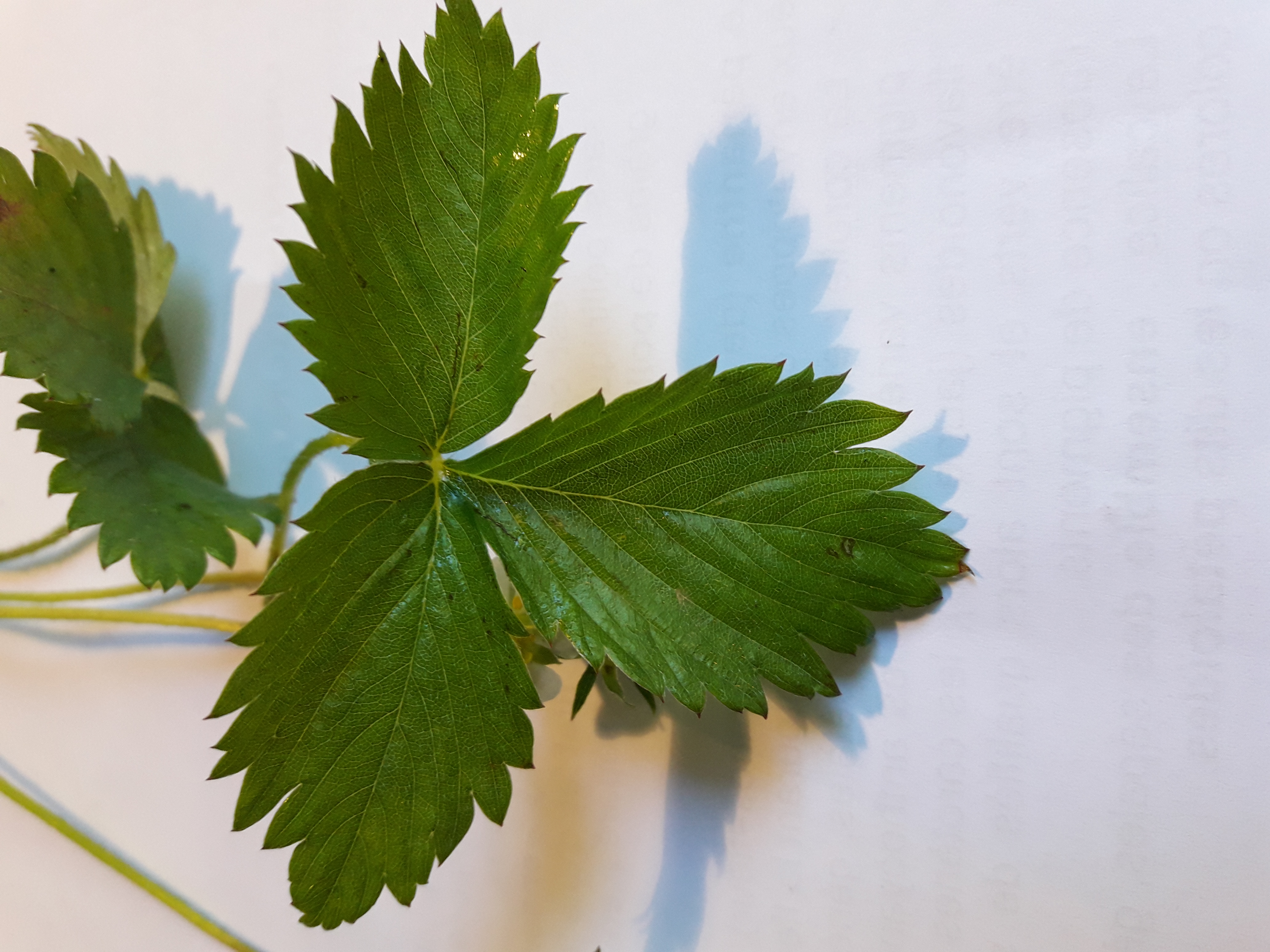 Les feuilles de la tige (à la base de noeuds) sont trois feuilles ovales vert uni - alors que les feuilles qui partent du collet sont par trois aussi mais elles sont séparées à leur base et digitées (?) et lobées (?) la couleur est différente,  les nervures et leur pourtour est plus foncé - elles sont comme tachetées.