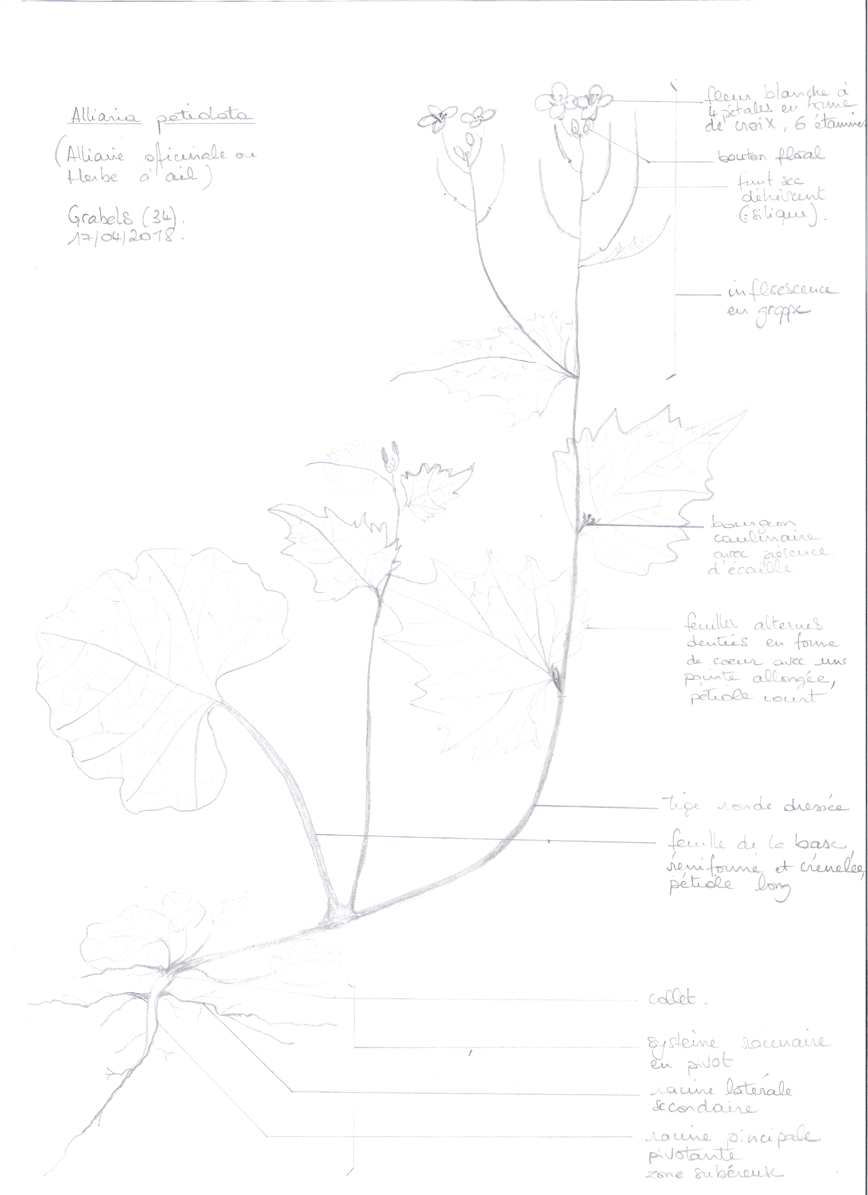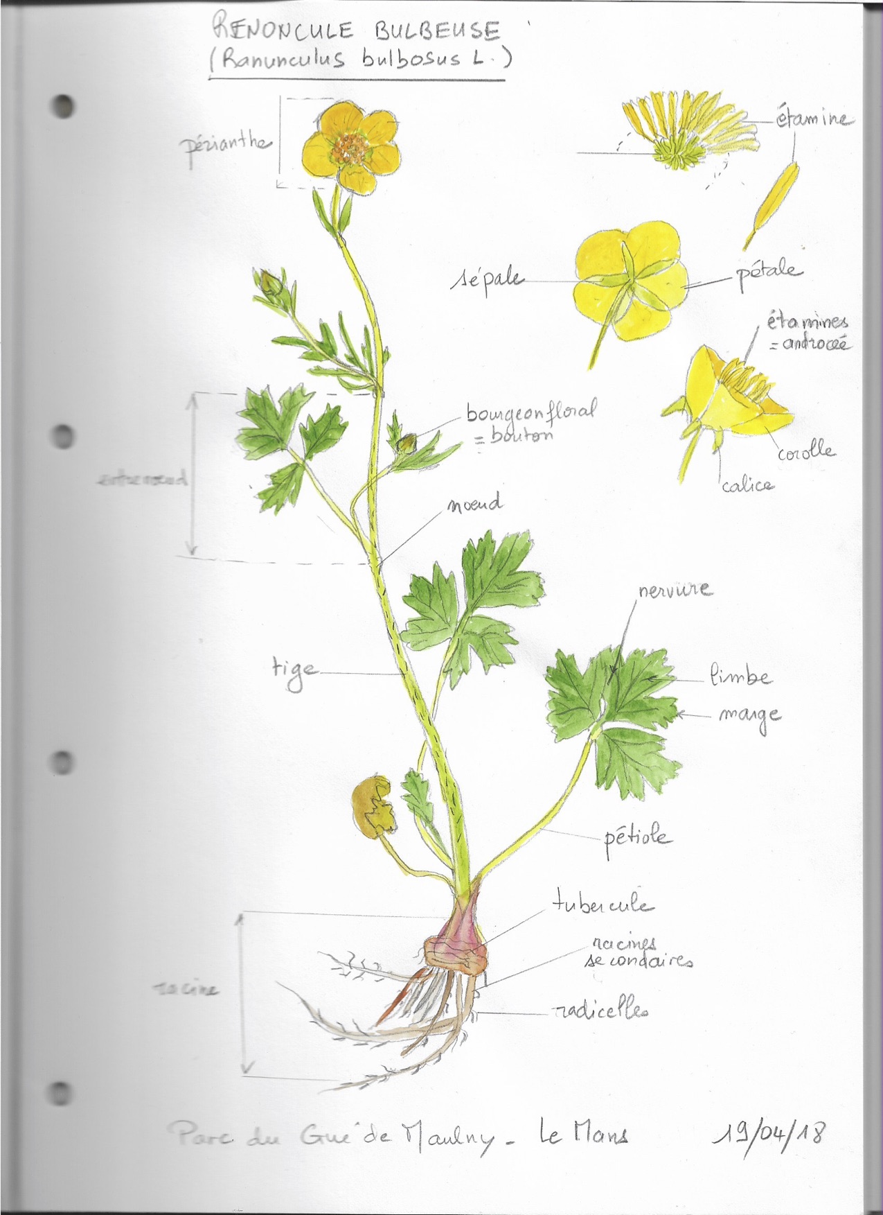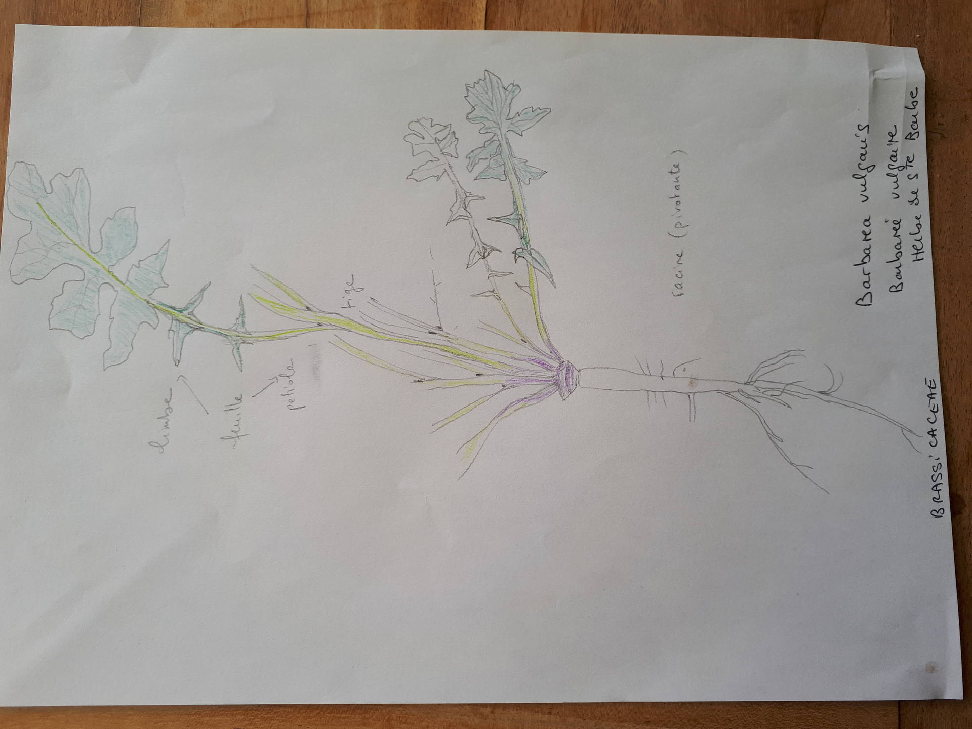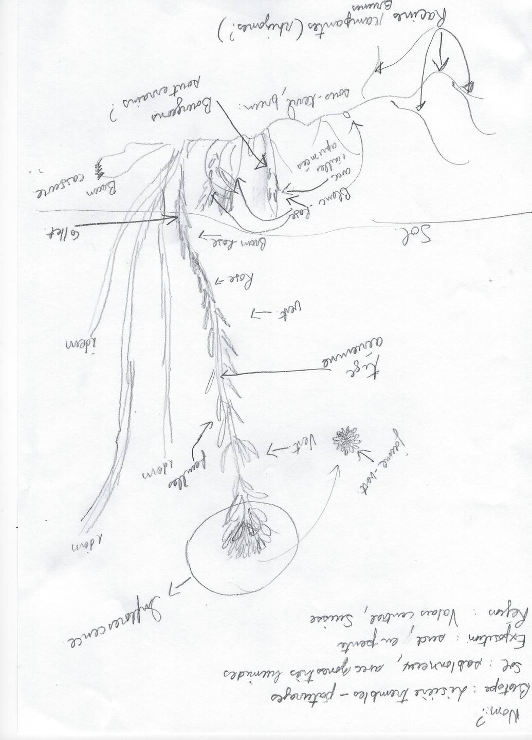 N'ayant pas pour habitude d'arracher une plante pour un usage autre qu'alimentaire / médicinal, je n'ai pas dessiné les racines. Cela peut poser problème pour certaines identifications mais je me contente en général de ce que je vois au-dessus du sol.
