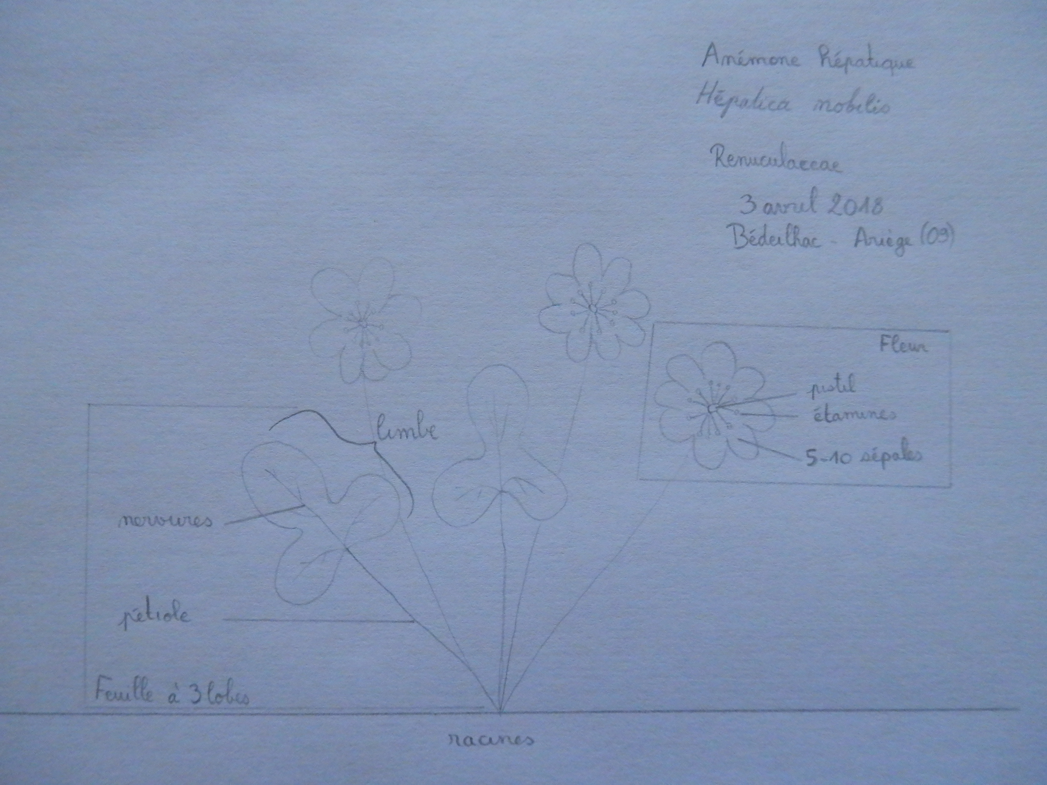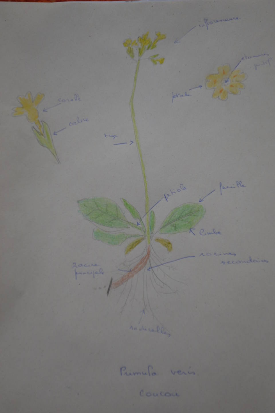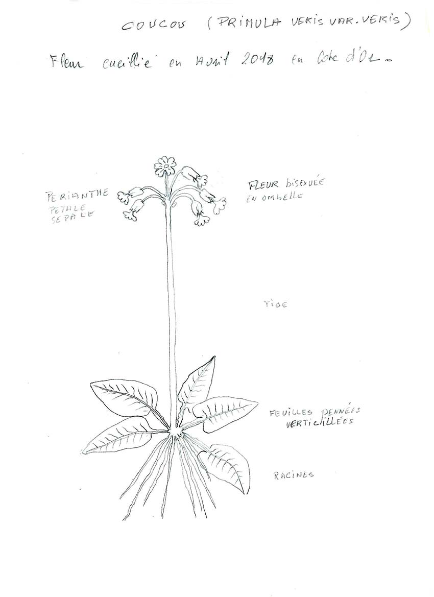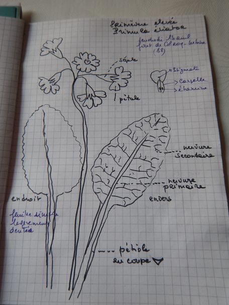 Voici le dessin d'une Primevère élevée, observée le 13 avril 2018 dans la forêt de Colroy Lubine Vosges.