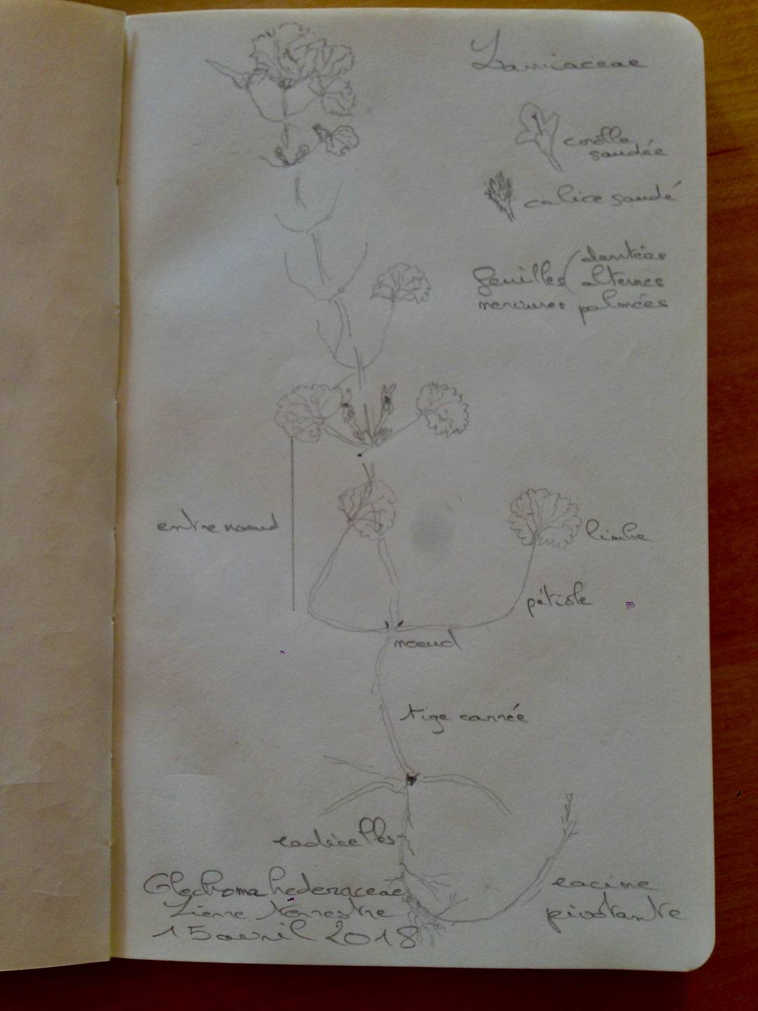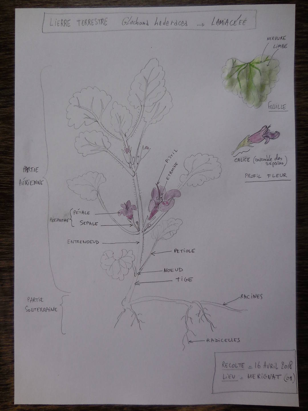 Voilà le croquis d'un pied de lierre terrestre récolté dans mon jardin (Mérignat, Ain).