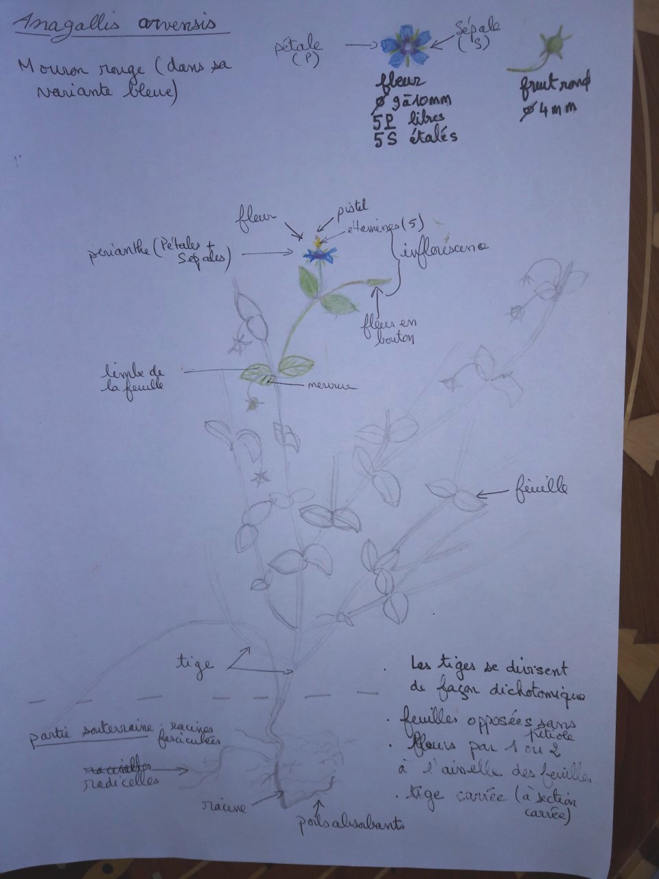 Schéma d'Anagallisarvensis , le mouron rouge, dans sa variante à fleurs bleues.