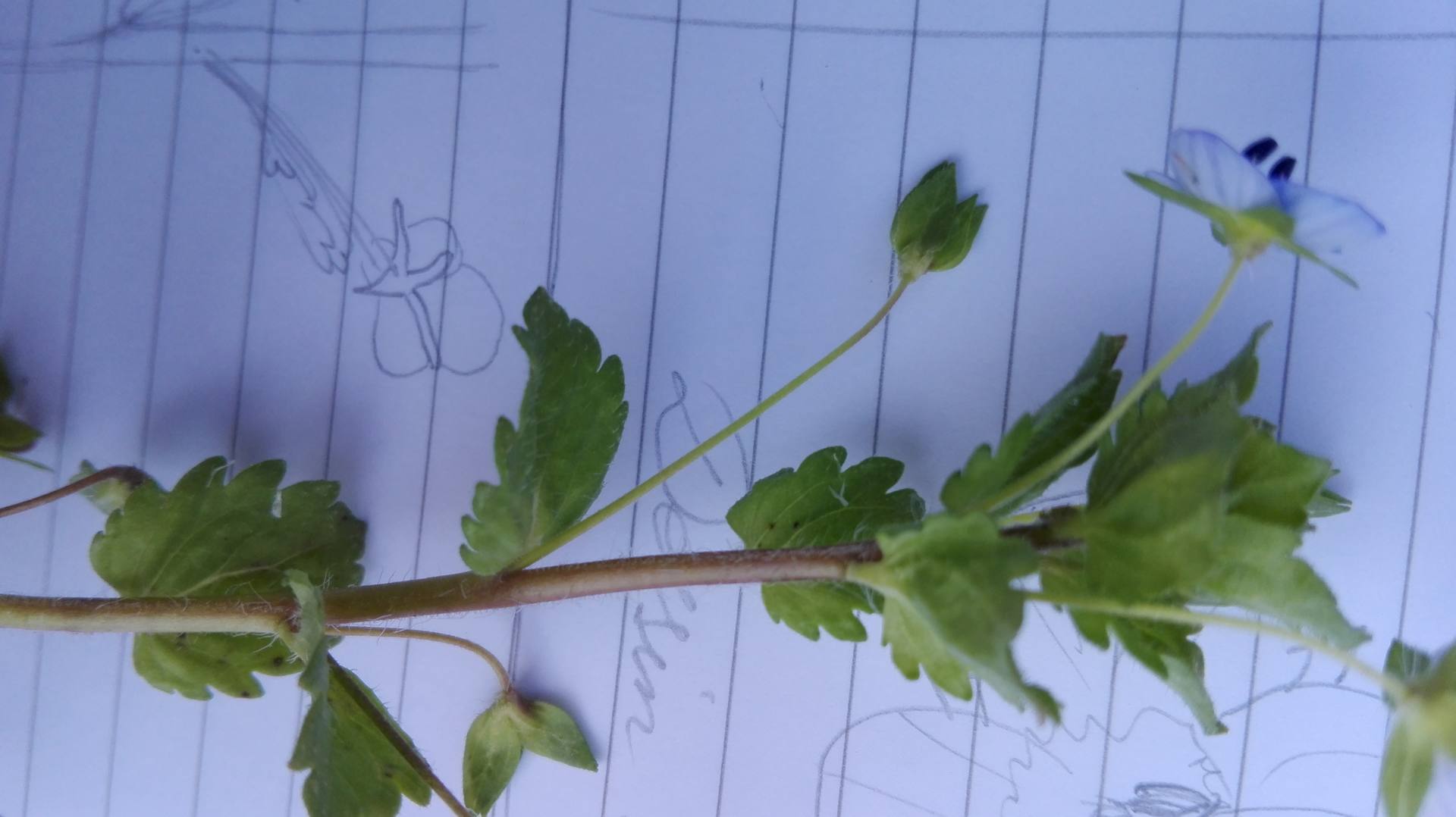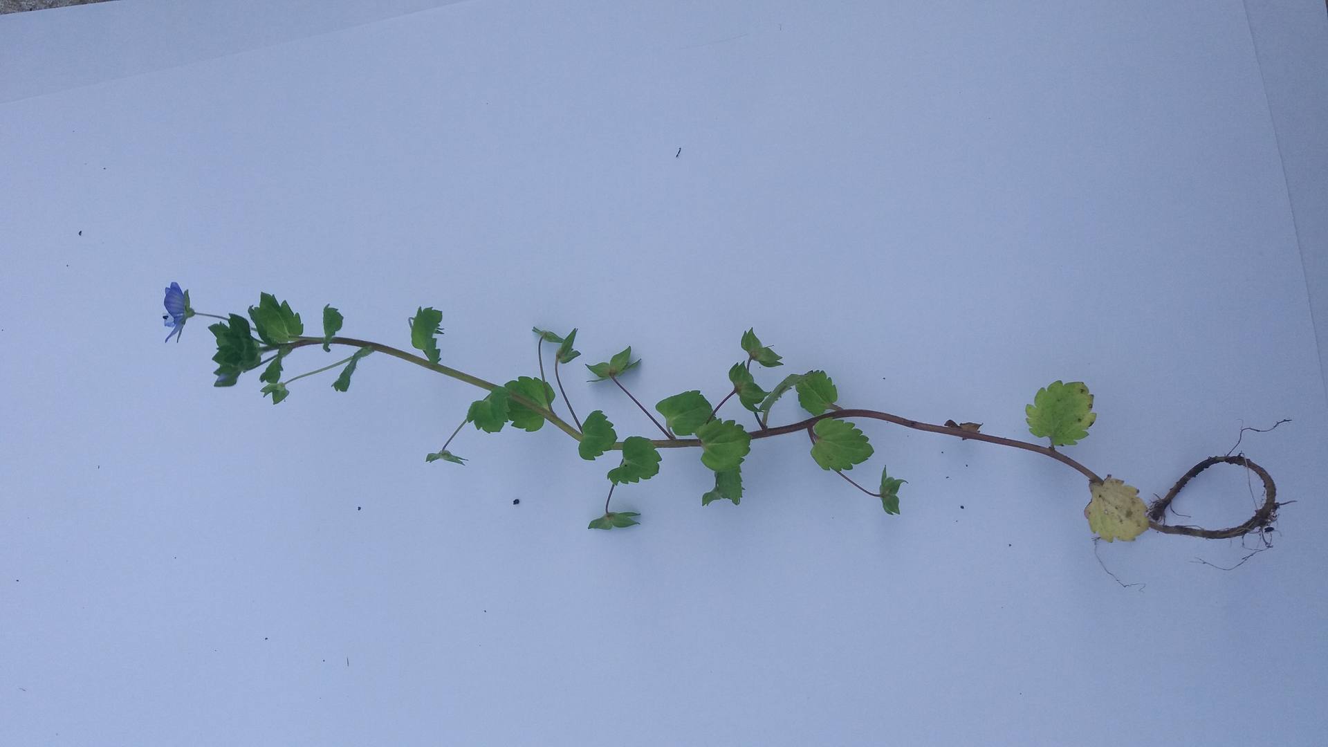 Cette plante fait partie de la famille des Scrofulariaceae. C'est une annuelle. Sa tige, cylindrique et poilue est en partie couchée et ramifiée. Ses feuilles arrondies (réniformes ?) sont opposées à la base de la tige et alternes à son extrémité. Leur bord est irrégulièrement denté et elles ont les deux faces poilues. Les fleurs sont petites et perdent très vite leurs 4 pétales bleu clair veinés de fines rayures d'un bleu plus foncé.