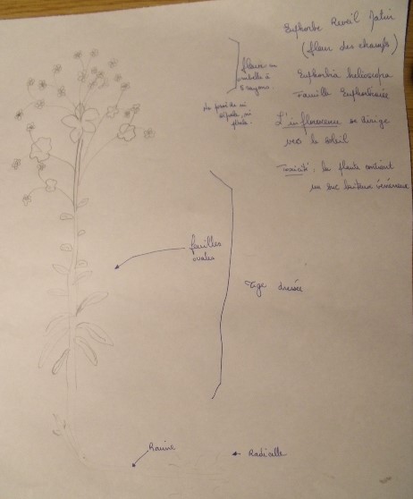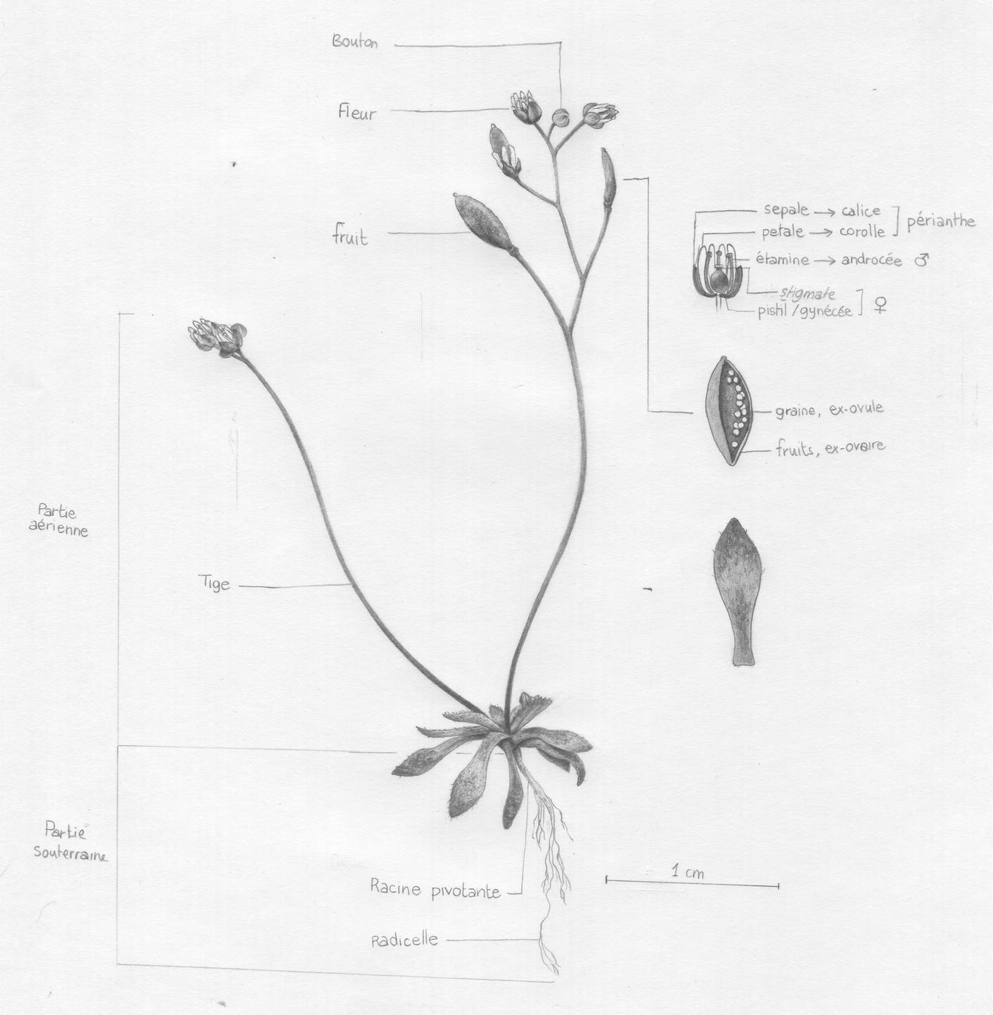 La Fleur est très petite ; il n'est pas facile de percevoir et de dessiner le gynécée et l'androcée !
