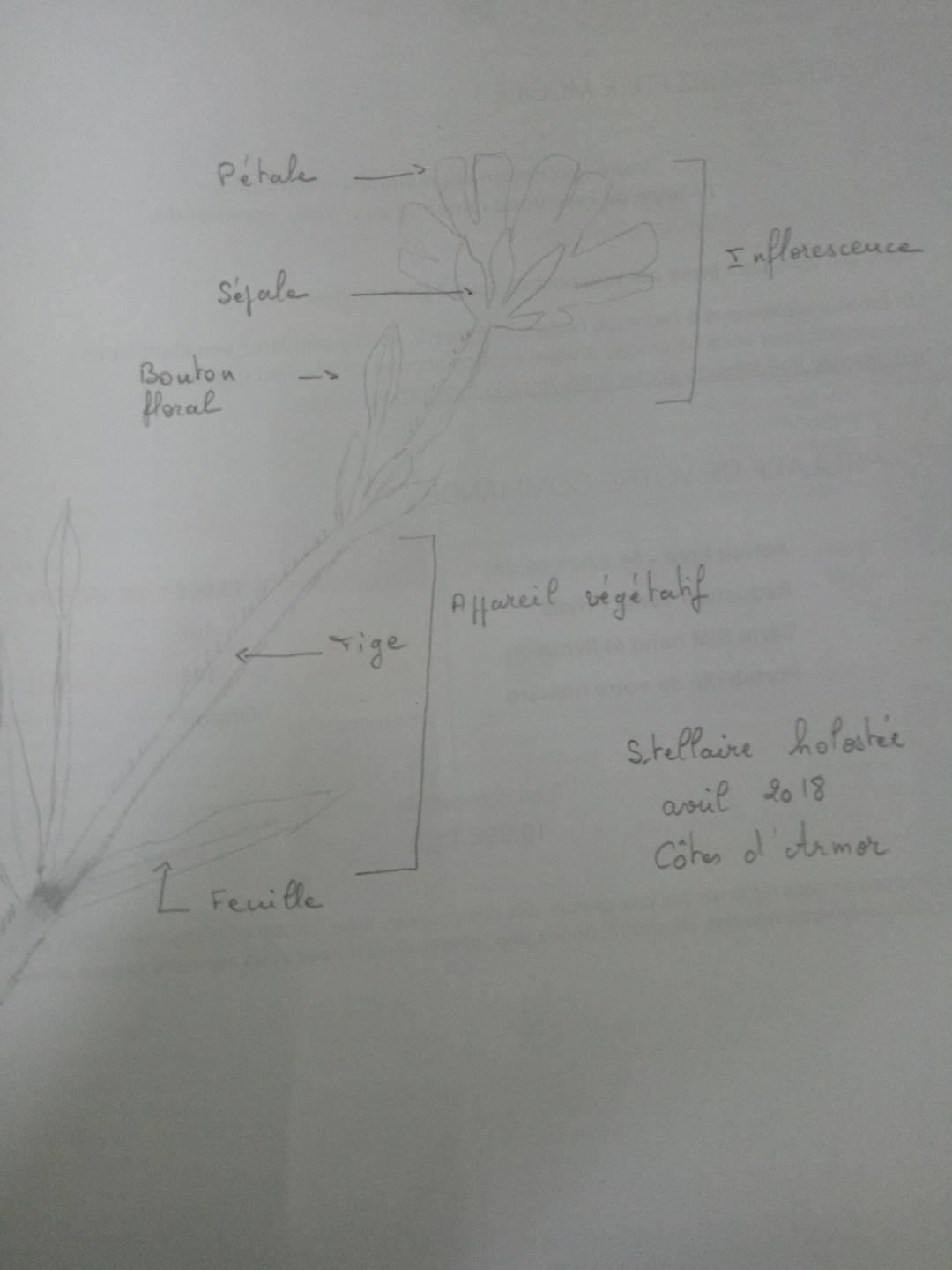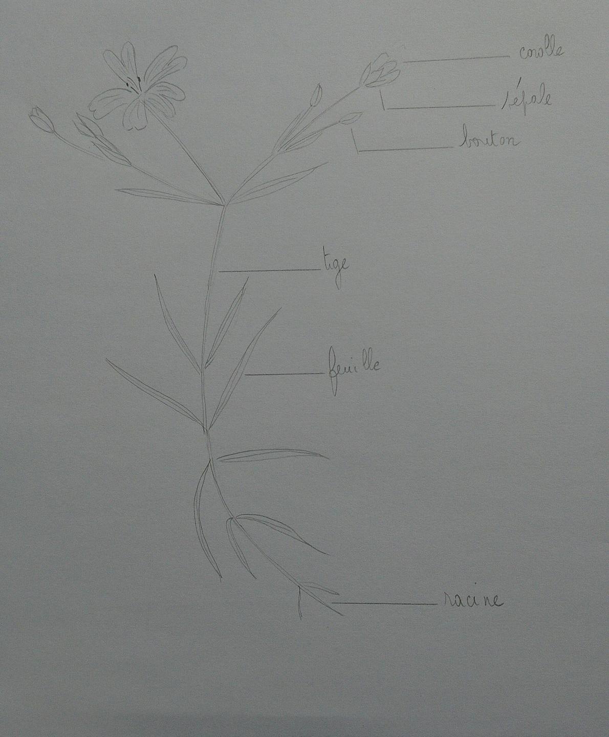 J'ai dessiné sur place le 8 avril 2018 une stellaire holostée (Stellaria holostea), herbacée vivace de la famille des caryophyllacées.