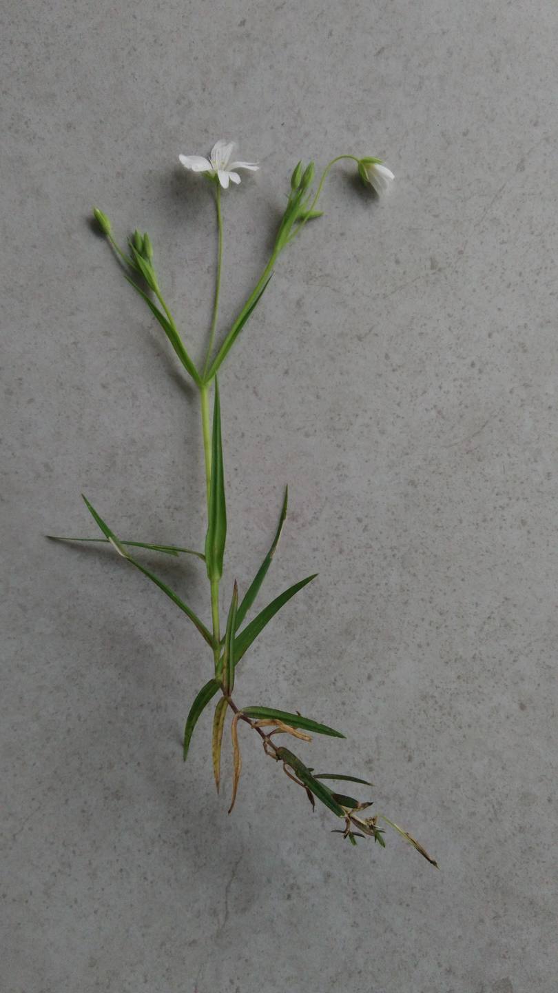 J'ai ramassé cette plante en bordure de champ il y a deux jours, elle s'arrache facilement et ne semble pas avoir de racine profonde.Elle pousse par ramification et recouvre ainsi de petites zones.Je n'ai pas trouvé son nom dans une flore avec mes connaissances actuelles mais j'ai cru voir sur le forum qu'il s'agissait d'une stellaire.
