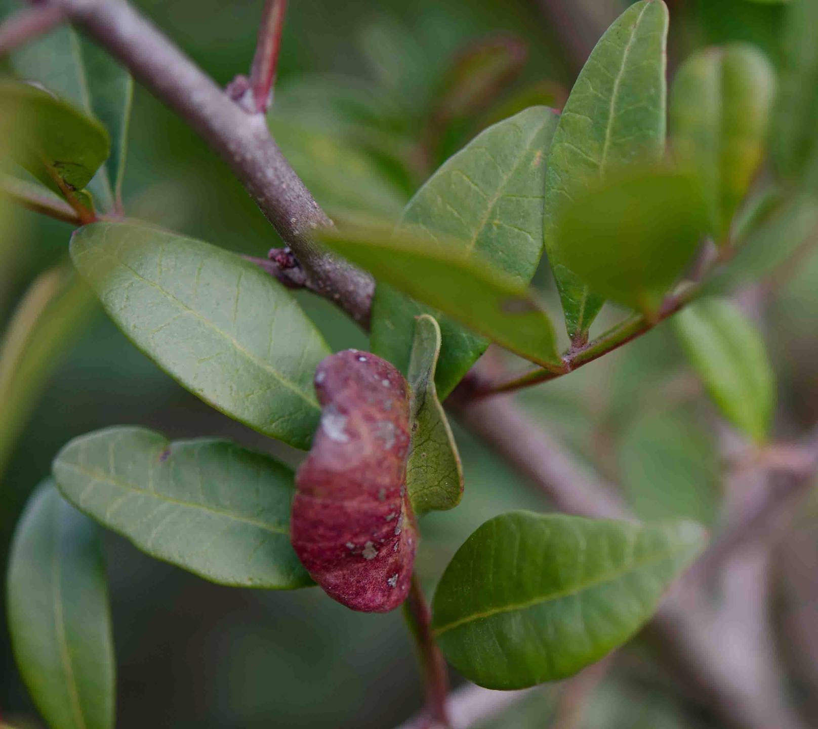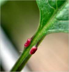 sur le pétiole des feuilles. Il s'agit de deux petites glandes rouges sur le haut du pétiole qui secrètent du nectar qui attire les fourmis. En échange, celles-ci font la police vis à vis d'autres insectes nuisibles à l'arbre.
