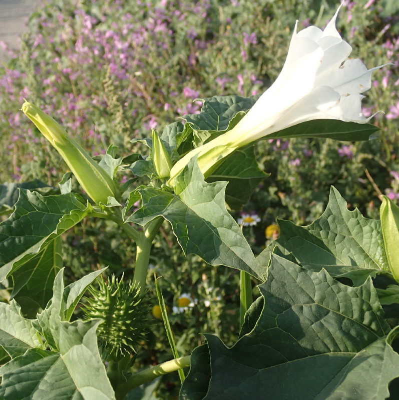 Nom scientifique : Datura stramonium, cette solanée est connue depuis longtemps comme "plante de sorcière". Ce sont en particulier ses propriétés hallucinogènes qui lui ont donné cette réputation. En médecine classique on utilise ses alcaloïdes : dopamine, atropine, hyoscyamine en particulier comme sédatif, et dans les anesthésiques.
