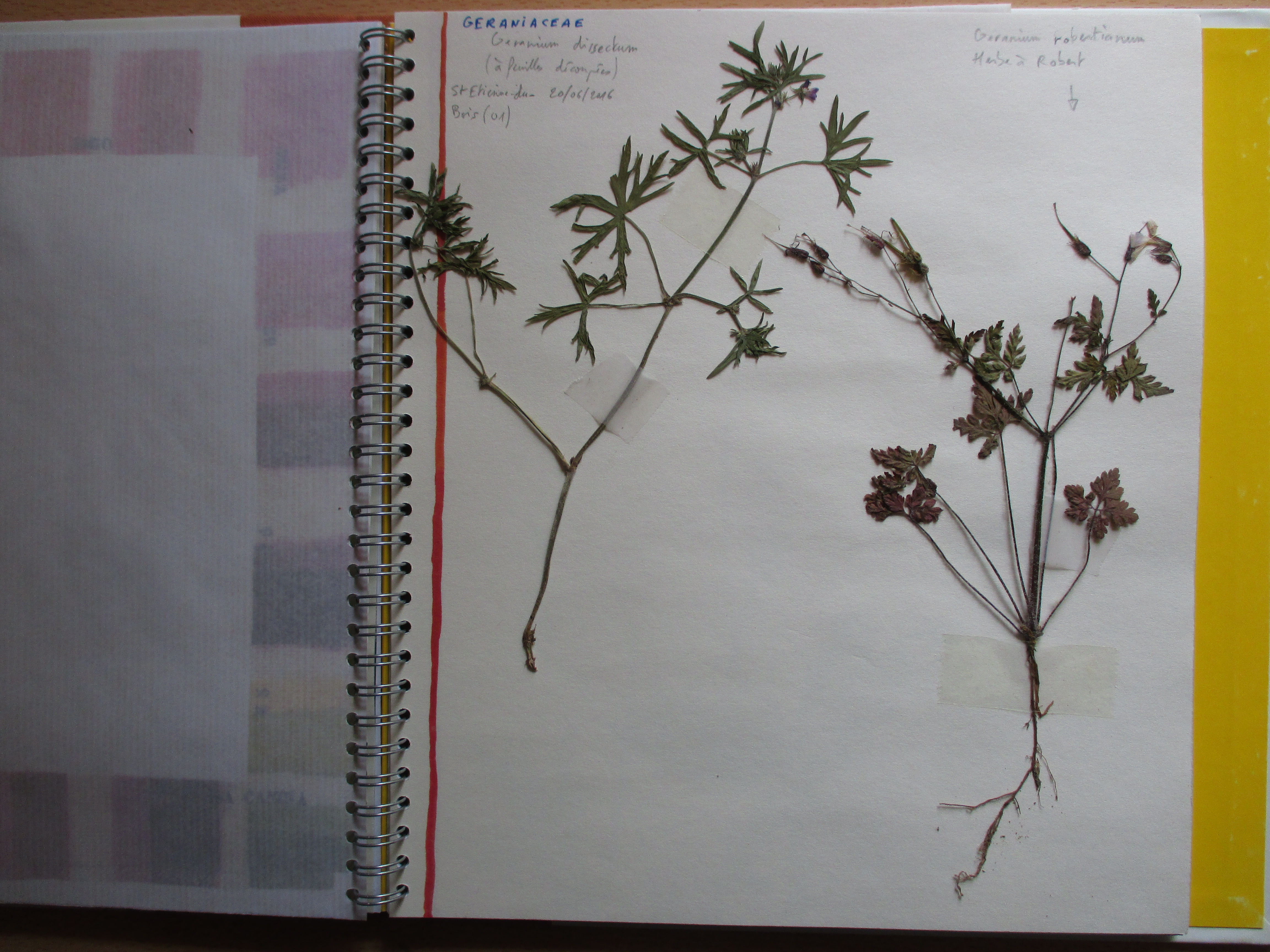 Voici une photo de mon herbier commencé en 2016. J'avais mis 2 Géraniums ensemble afin de mieux les comparer.