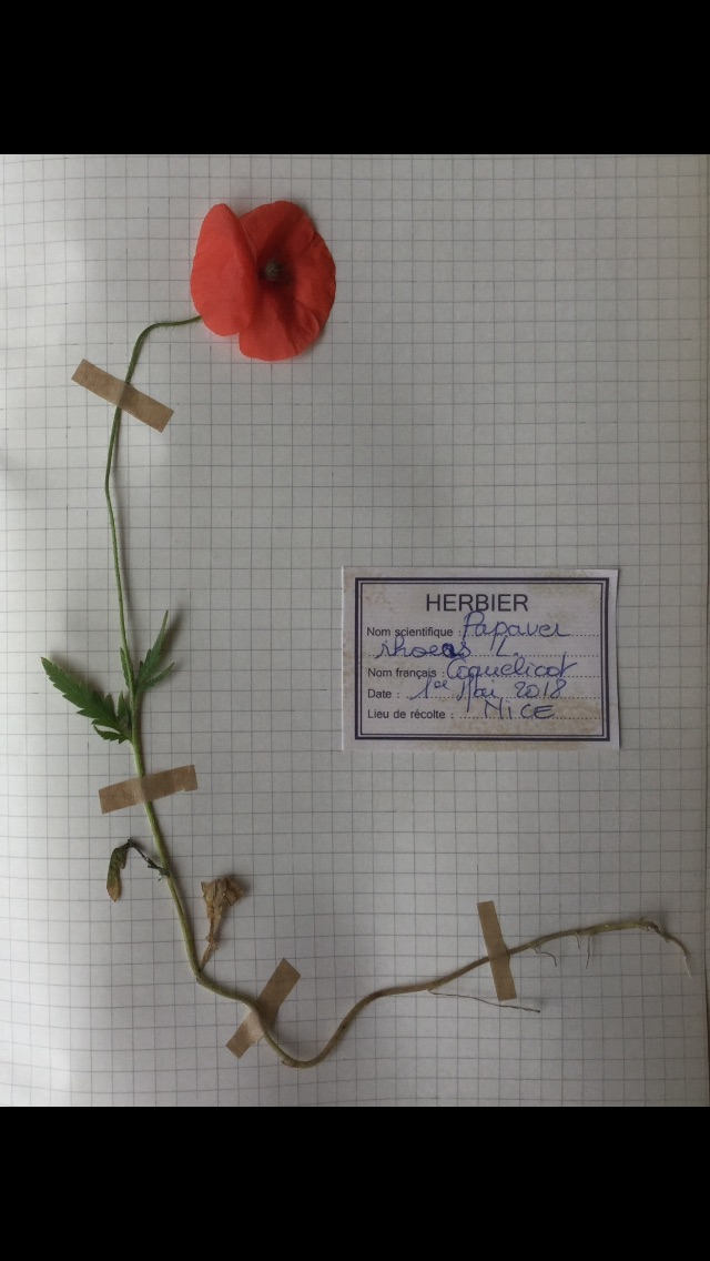 Pour commencer mon herbier, j’ai choisi un simple coquelicot printanier. Je l’ai récolté entre mur et trottoir. Le coquelicot est une plante médicinale :