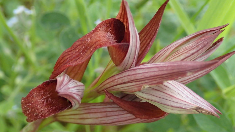 Dans la liste rouge des plantes menacées en Midi-Pyrénées établie par l'UICN, (4 photos tirées de eFlore ) j'ai choisi la Neotinea lactea , le Trifolium resupinatum, l'Oenanthe silaifolia, toutes 3 classées vulnérables ,l'Orchis coriophora classée en danger tout comme la Serapias Cordigera que j'ai découverte, dans une grande prairie, proche de Serapias lingua; d'orchis pyramidalis et purpurea. A voir le nombre qu'il y avait de cette espèce, je ne pensais pas du tout qu'elle était en danger;