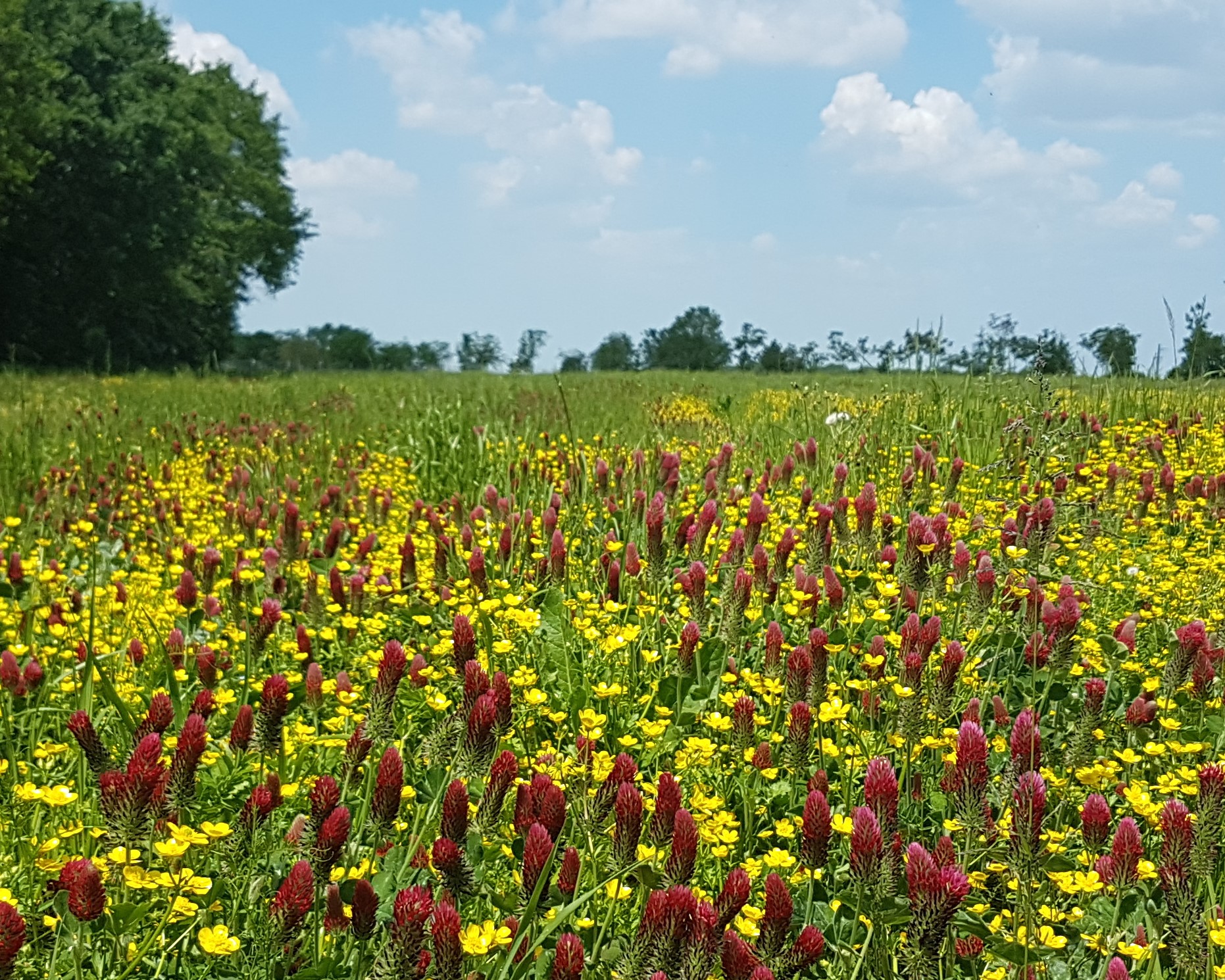 je mets une photo de rando dans mon coin Morbihannais, site des ardoisières avec des strates herbacée bruyère, ajonc défleuri, asphodèles et arborescentes avec feuillus et épineux. Ainsi qu'une légumineuse le Trèfle Incarnat ou Trifolium incarnatum de la famille des Fabaceae, superbe par sa couleur rouge vif mais également il appartient à la famille des légumineuses, il abrite dans ses racines des bactéries capables de se nourrir de l’azote de l’air, ce qui lui permet, après sa mort, d’enrichir le sol, enfin son puissant système racinaire se développe fortement dès la fin de l’hiver ce qui permet aussi d’aérer le sol en profondeur.