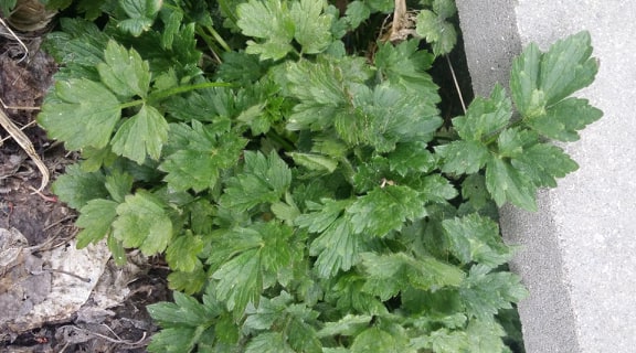 Elle possède des tiges velues vertes et pourpre, des feuilles digitées et des fleurs jaunes.