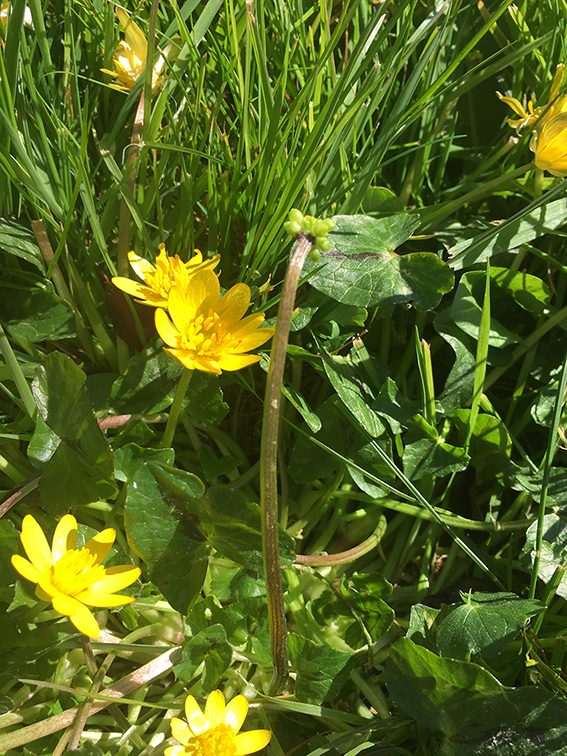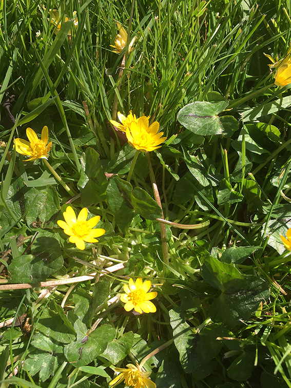 je vous présente la Ficaire, très commune dans la région, souvent en mis- l'ombre. elle aime la fraîcheur et l’humidité. Elle fait partie de la famille des renoncules dont elle se distingue facilement à la forme des ses feuilles. Certains l'utilisent pour des propriétés médicinales.