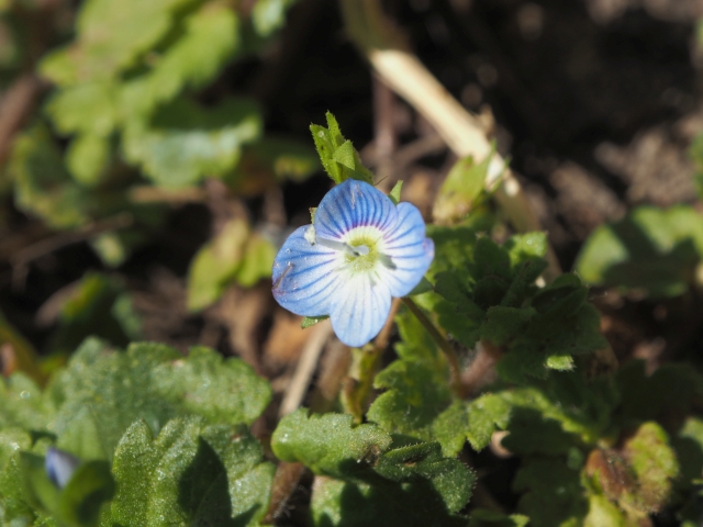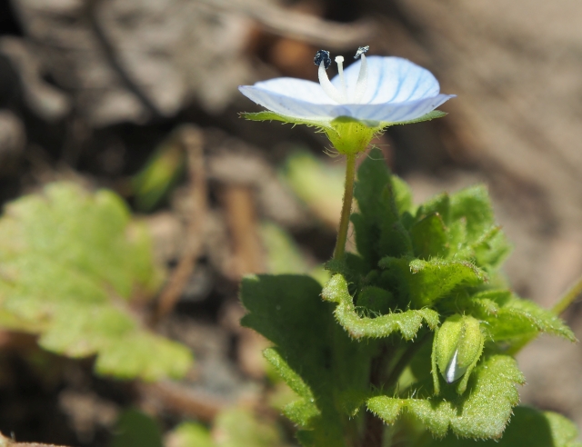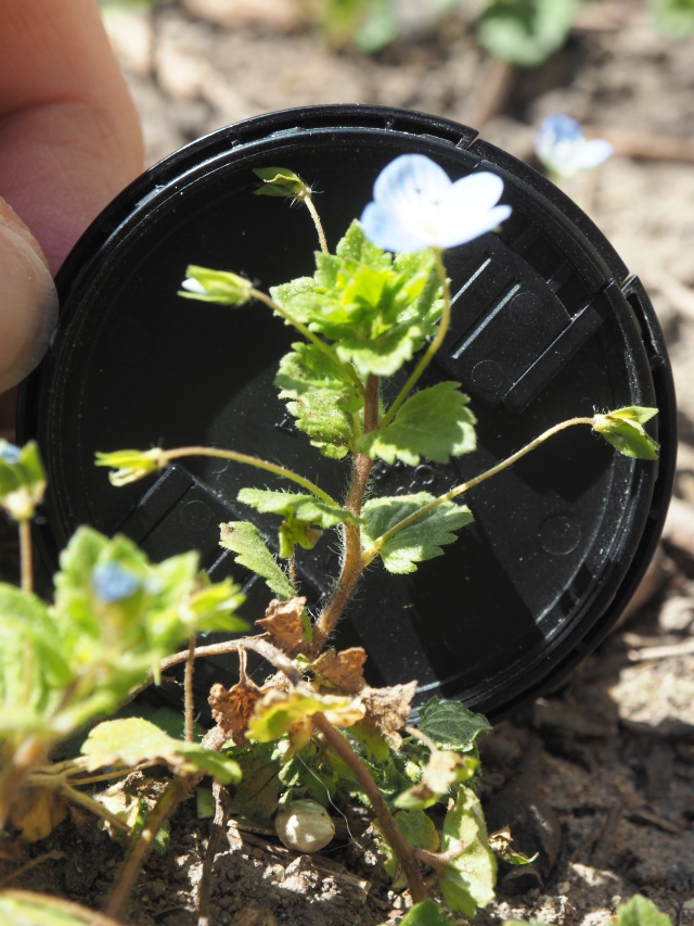 Voici une petite plante qui pousse un peu partout autour de chez moi, une espèce du genre Veronica. Il s'agit peut être de veronica filiformis, mais sans certitude. Je l'ai photographiée dans un chemin entre vignes et champs, dans le massif de Saint Thierry du côté de Reims, en Champagne.