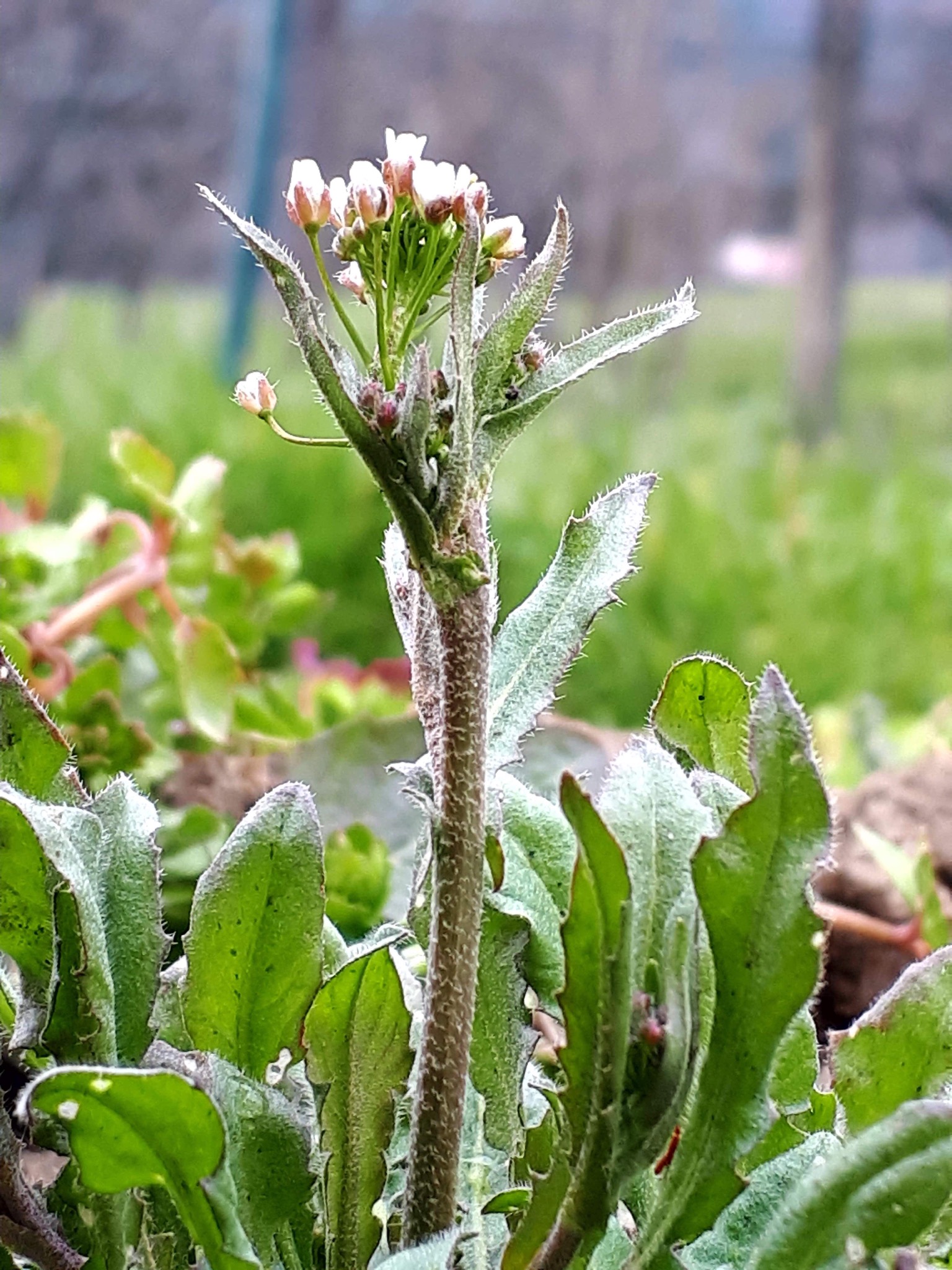C'est une Brassicacée, ses feuilles sont en forme de cœur avec des dents arrondies au bord et ses petites fleurs blanches en grappe comportent 4 pétales.