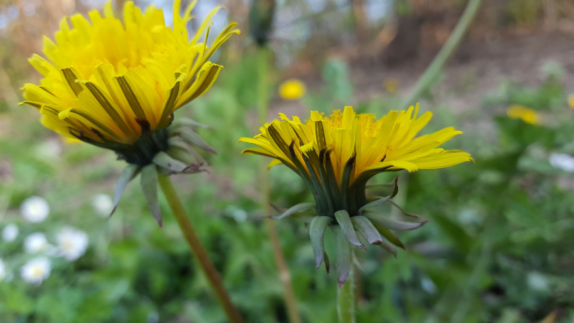 Les feuilles, ainsi que les tiges soutenant les fleurs, semblent partir d'une même base. Les feuilles partent en cercles autour du centre, elles s'élevent peu à la verticale mais restent plutôt prés du sol, contrairement au tiges qui elles sélèvent beaucoup plus à la verticale tout en ayant un petit arrondi. Les tiges des fleurs n'ont pas de feuilles, elles sont assez hautes (une dizaine de cm). La tige est creuse, ronde et de couleur vert/rouge. La fleur qui se trouve au bout de la tige est composé de beaucoup de pétales jaune, long (1,5cm) et mince. Les feuilles semblent symétrique en leur milieu. Elles sont assez longues mais coupées en différent morceaux qui forment un peu comment un arc sauf pour le dernier qui est plutot comment une flèche.