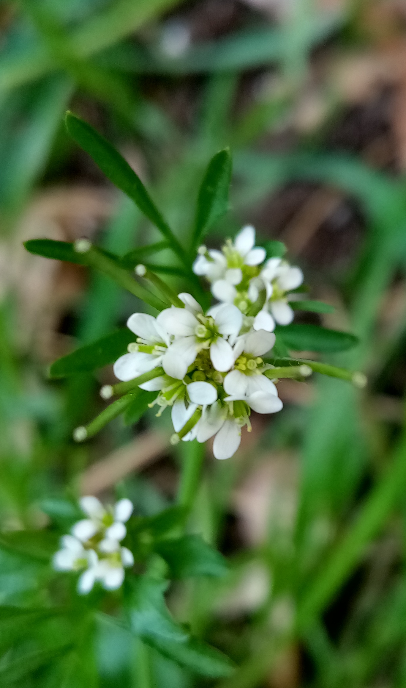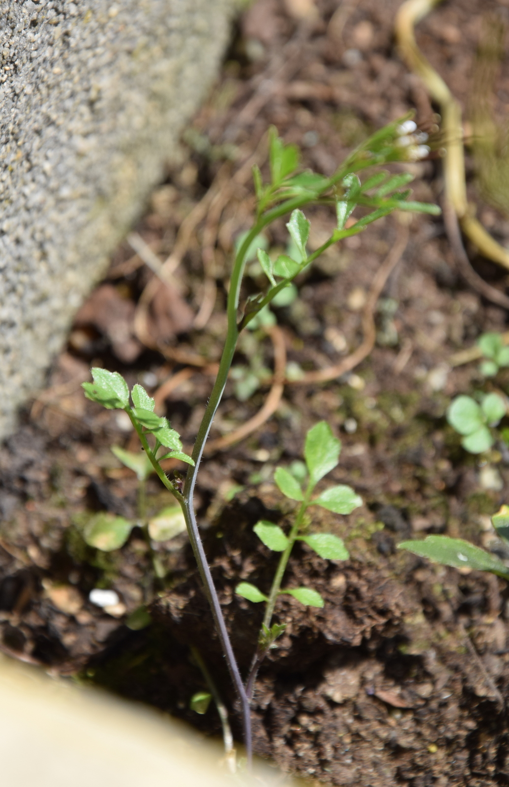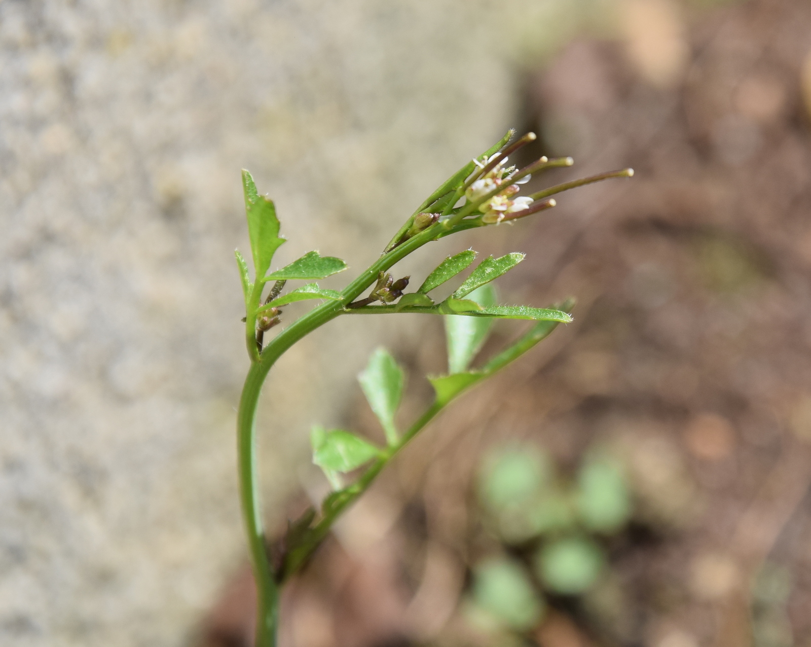 Voici une Cardamine hérissée je pense, une petite plante prise en photo dans un potager en Ille et Vilaine. Elle a une rosette de feuille à la base, ces feuilles sont pennées et légèrement poilu sur le dessus. Les fleurs comportent 4 pétales blanches et 5 étamines. La tige et les feuilles sont vertes et pourpres.Les fruits ressemblent à des petits bâtons marron/noir dans lesquels on discerne des petites boules rangées en long.