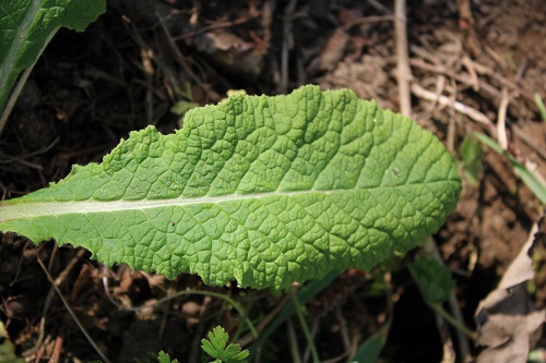 Les feuilles proches du sol ont une extrémité arrondie tandis que les feuilles plus loin du sol sont pointues au bout. De près, on s'aperçoit qu'elles sont cernées de petites épines.